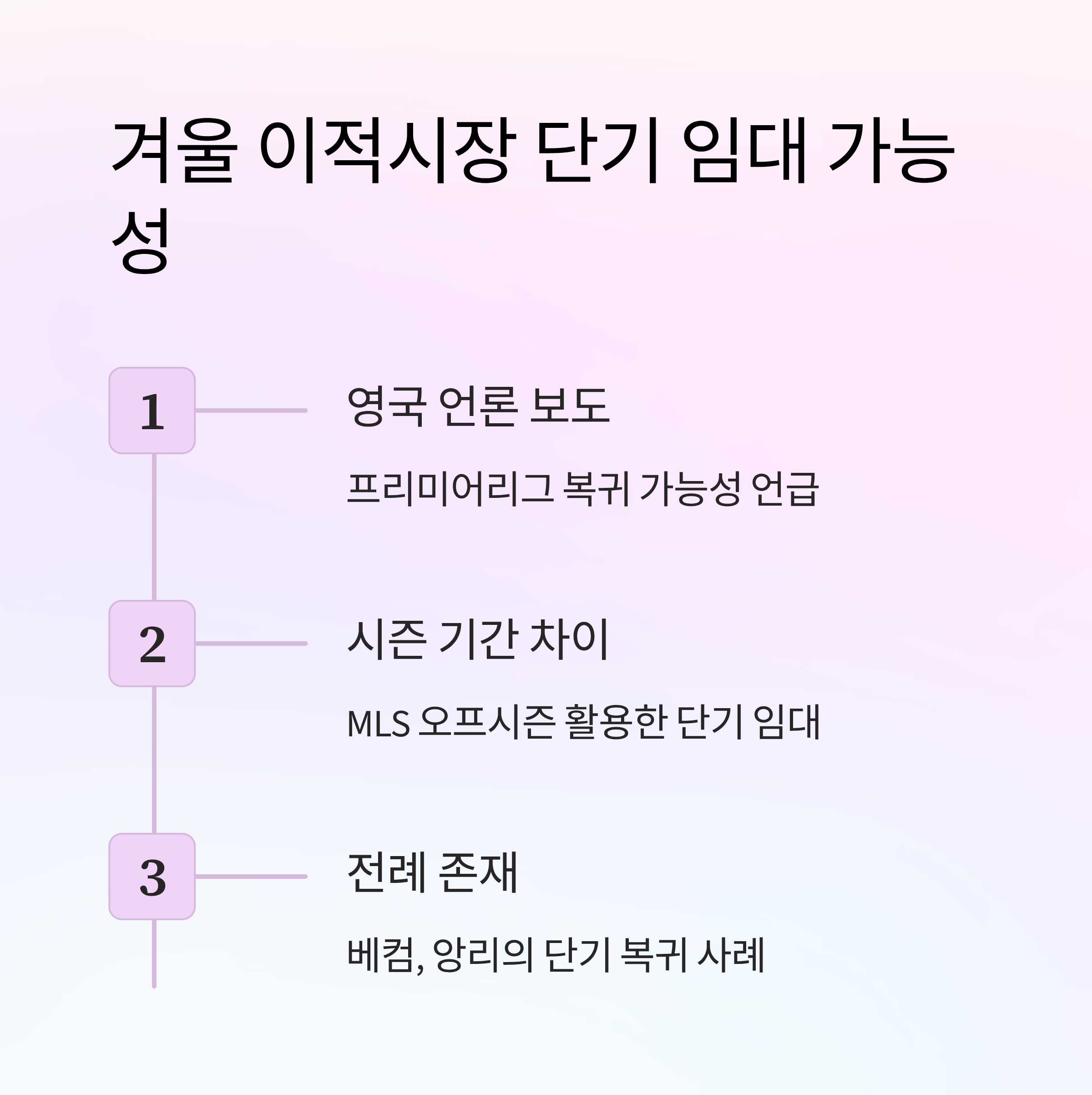 손흥민의 유럽 복귀 가능성 소식은 최근 영국 매체를 통해 보도되면서 토트넘 팬들을 비롯한 축구 팬들에게 큰 화제가 되었습니다. 메이저리그와 유럽 리그 간 시즌 기간 차이를 고려할 때, 손흥민은 겨울 이적 시장에서 단기 임대로 EPL에 복귀할 가능성이 높습니다. 과거 데이비드 베컴이나 티에리 앙리의 사례처럼 미국 리그 선수들이 단기적으로 유럽 리그에 참여했던 전례를 따를 수 있으며, 이는 손흥민에게도 경기 감각 유지 및 전술적 경험의 좋은 기회가 될 것입니다. 이와 더불어 유럽 복귀가 현실화될 경우 전 세계 축구 팬들에게 또 한 번 큰 이슈를 만들어낼 것으로 보입니다.