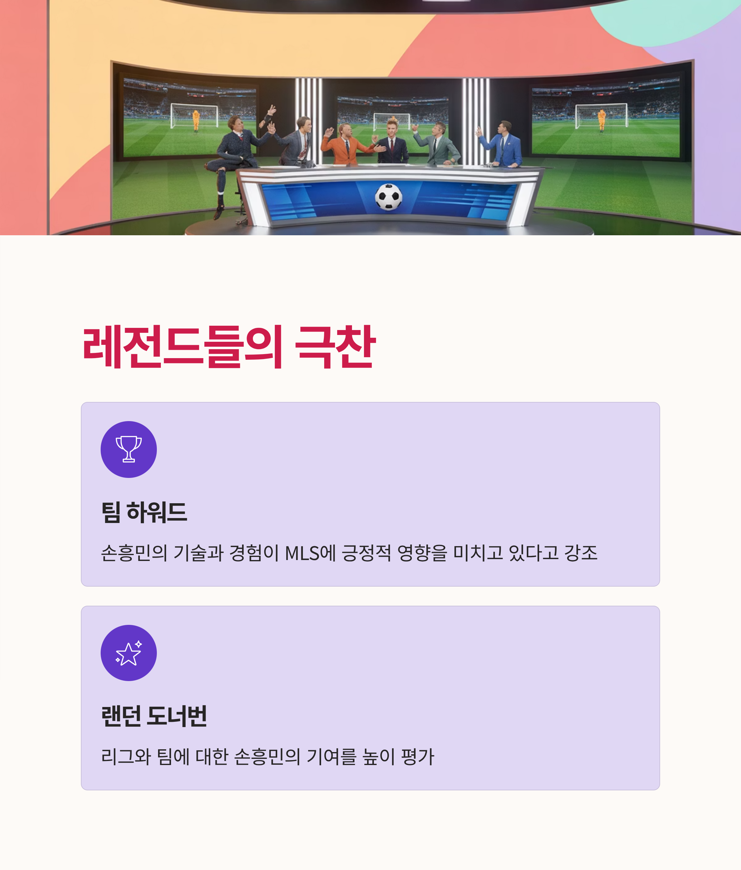 • 팀 하워드, 랜던 도너번 같은 축구 레전드들은 손흥민을 극찬하며 그가 MLS에 미치는 긍정적인 영향을 강조하고 있습니다.