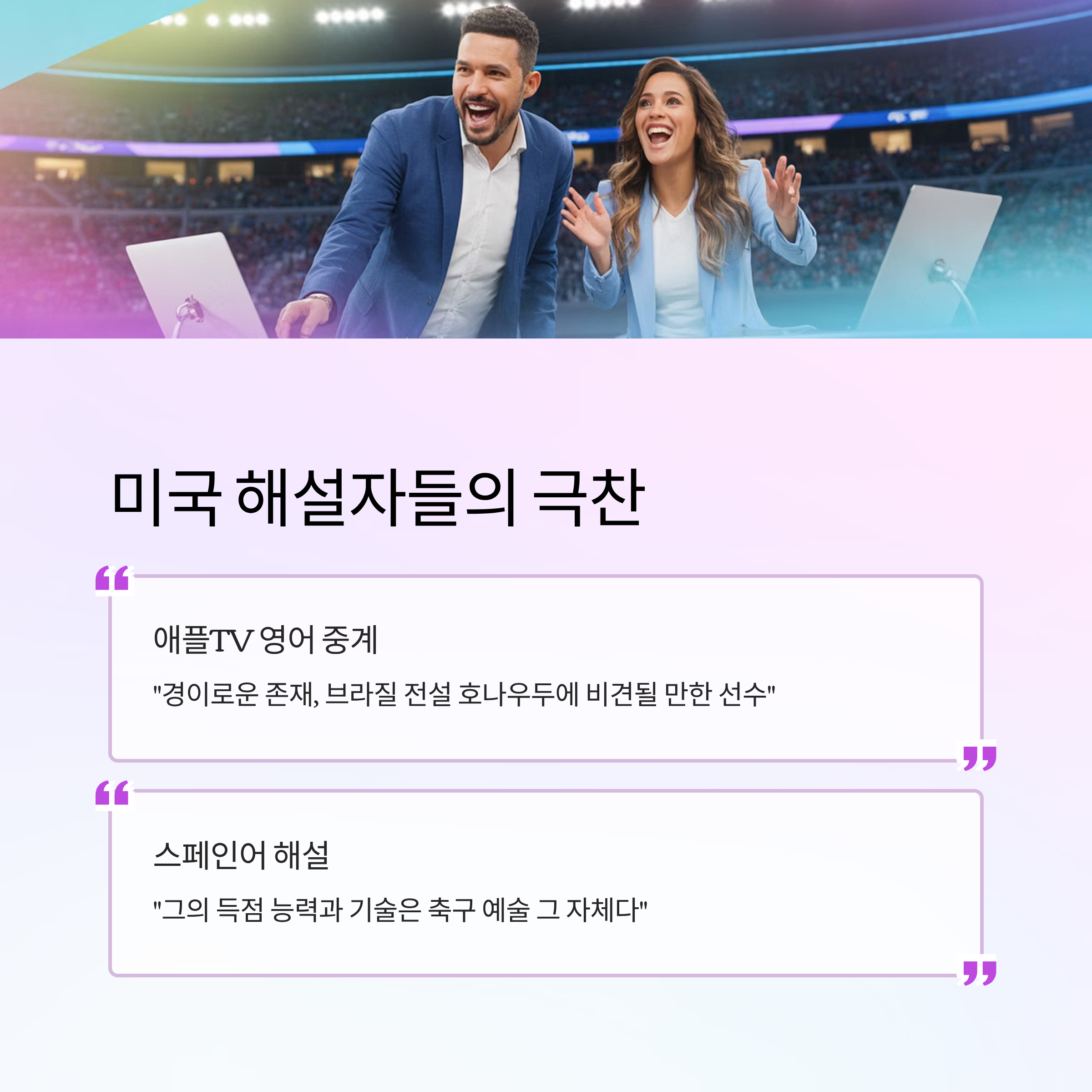 미국 및 스페인 중계진은 손흥민을 기술적 완벽성과 속도를 기반으로 한 월드클래스 선수로 평가했습니다.