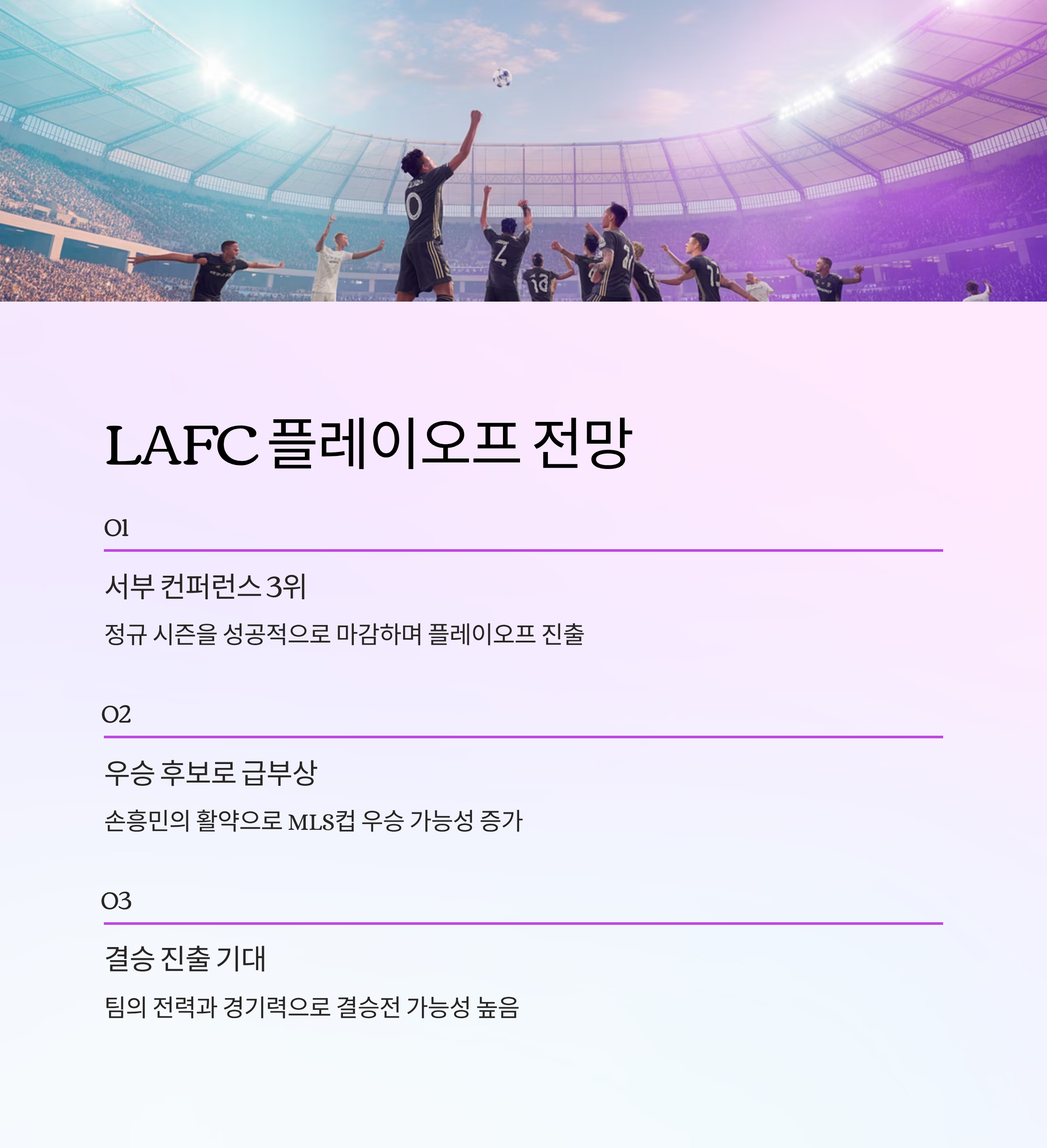 LAFC는 손흥민의 활약 덕분에 플레이오프 3위로 진출해 MLS컵 우승 가능성이 높아졌습니다.