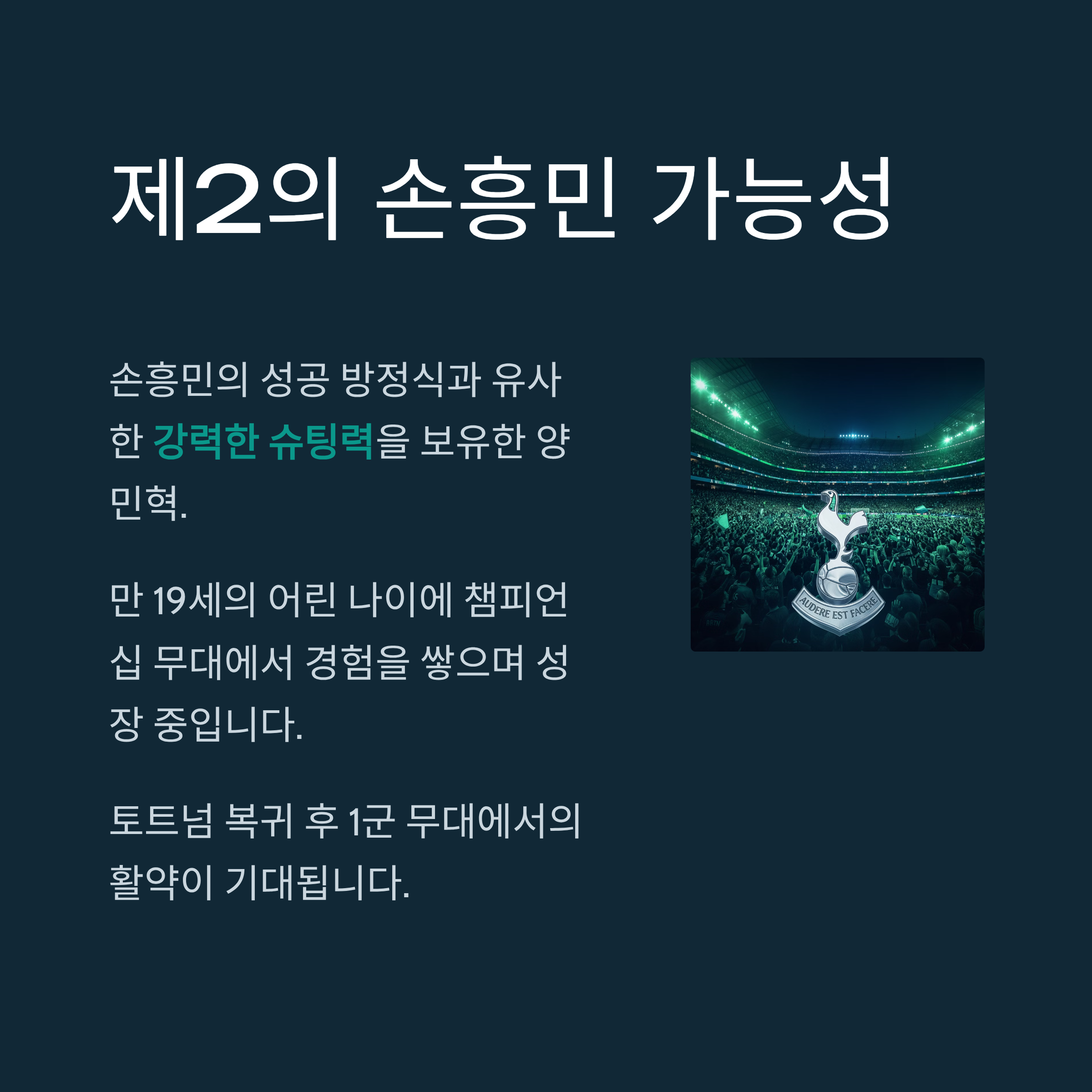 양민혁의 가장 큰 장점은 박스 근처에서의 탁월한 결정력과 강력한 슈팅력입니다. 이는 현대 축구에서 공격수에게 요구되는 가장 중요한 덕목 중 하나이며, 대선배 손흥민의 성공 방정식을 떠올리게 합니다. 물론 아직 경험 부족으로 인한 기복 있는 모습은 그가 반드시 극복해야 할 과제입니다. 하지만 만 19세의 어린 나이에 잉글랜드 2부 리그라는 거친 무대에서 부딪히고 성장하며, 중요한 순간에 해결사 역할을 해내는 모습은 그의 미래를 더욱 기대하게 만듭니다. 이번 임대는 그가 1군 선수로 성장하기 위한 소중한 자양분이 될 것입니다. 한국 축구 팬들은 비록 그가 토트넘 유니폼을 입고 뛰는 모습을 당장 볼 수는 없지만, 먼 타지에서 묵묵히 자신의 길을 개척해나가는 어린 선수의 성장을 응원하며 지켜볼 필요가 있습니다. 양민혁이 이번 극장골을 발판 삼아 꾸준한 활약을 펼쳐, 다음 시즌 토트넘의 당당한 일원으로 복귀할 수 있기를 기대해 봅니다.