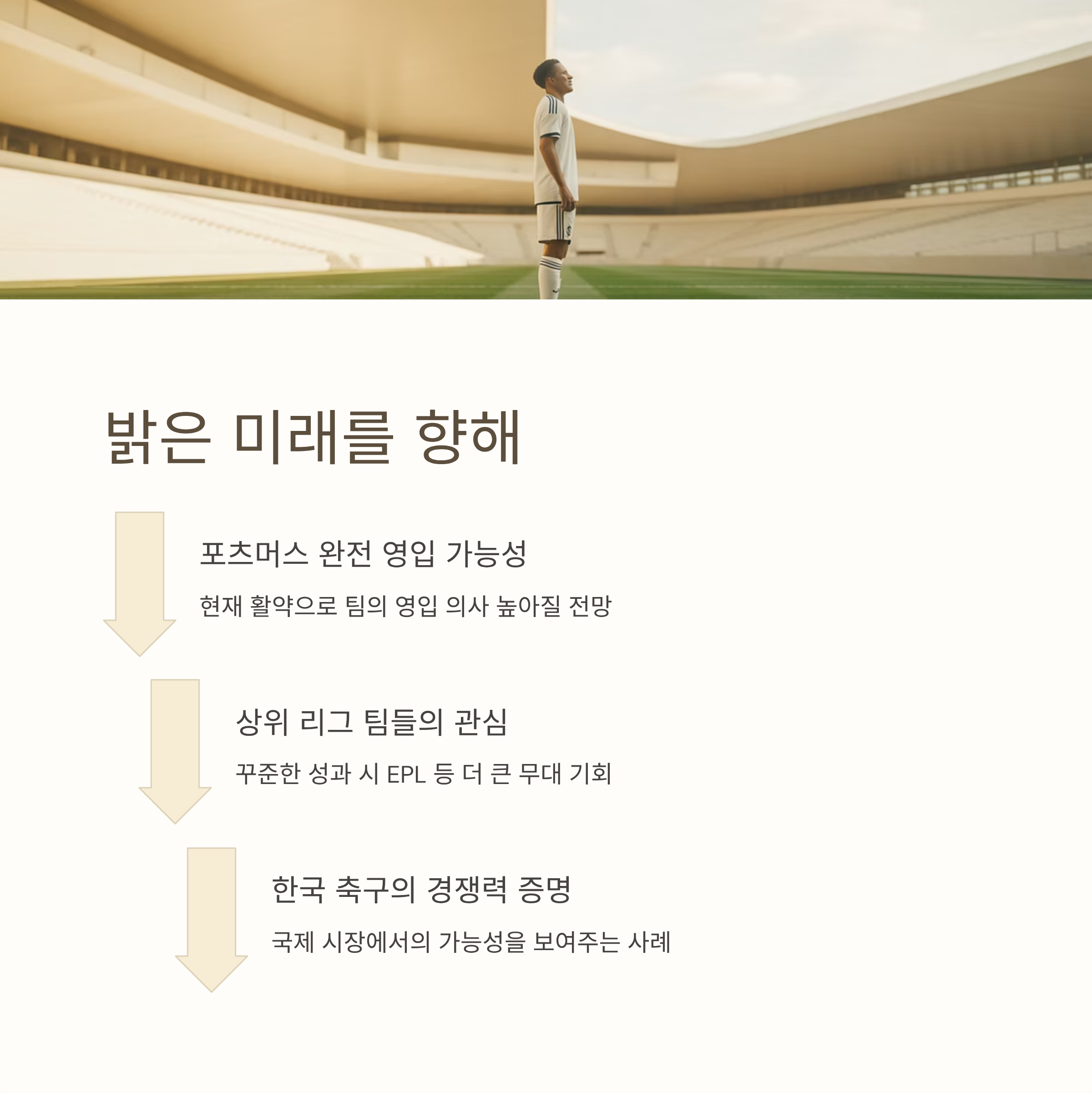 회의적인 시선도 여전히 존재하지만, 그가 남은 시즌 동안 꾸준한 경기력과 연속된 성과를 보여준다면, 향후 EPL 등 더 큰 무대에서 활약할 기회를 잡게 될 가능성도 분명 존재합니다. 이는 단순히 선수 개인에 대한 긍정적 전망뿐 아니라, 한국 축구가 얼마나 국제 시장에서 경쟁력을 갖출 수 있는지 확인할 수 있는 좋은 사례로 남게 될 것입니다.