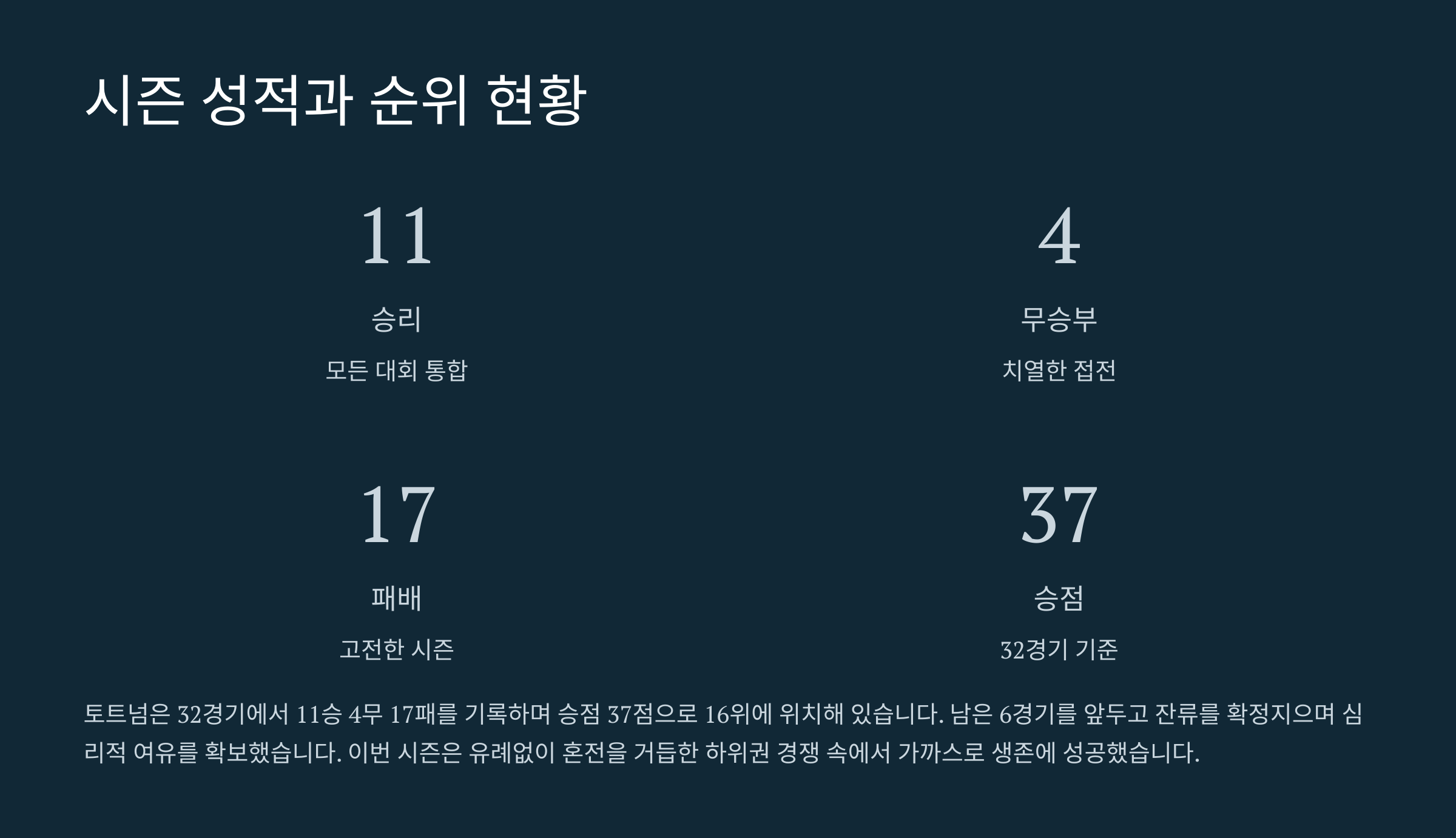 2. 현재 토트넘은 32경기 기준으로 11승 4무 17패, 승점 37로 리그 16위에 위치해 있습니다.