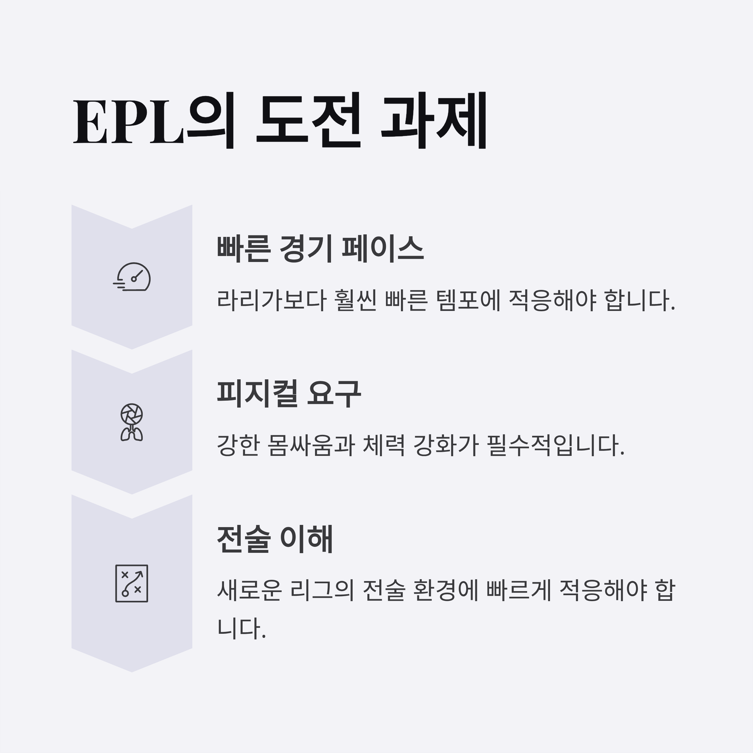 | A. EPL은 빠른 페이스와 강한 피지컬을 요구합니다. 따라서 이강인은 체력을 보강하고 새로운 전술 환경에 적응하는 과정 속에서 지속적인 성장이 필요합니다. |