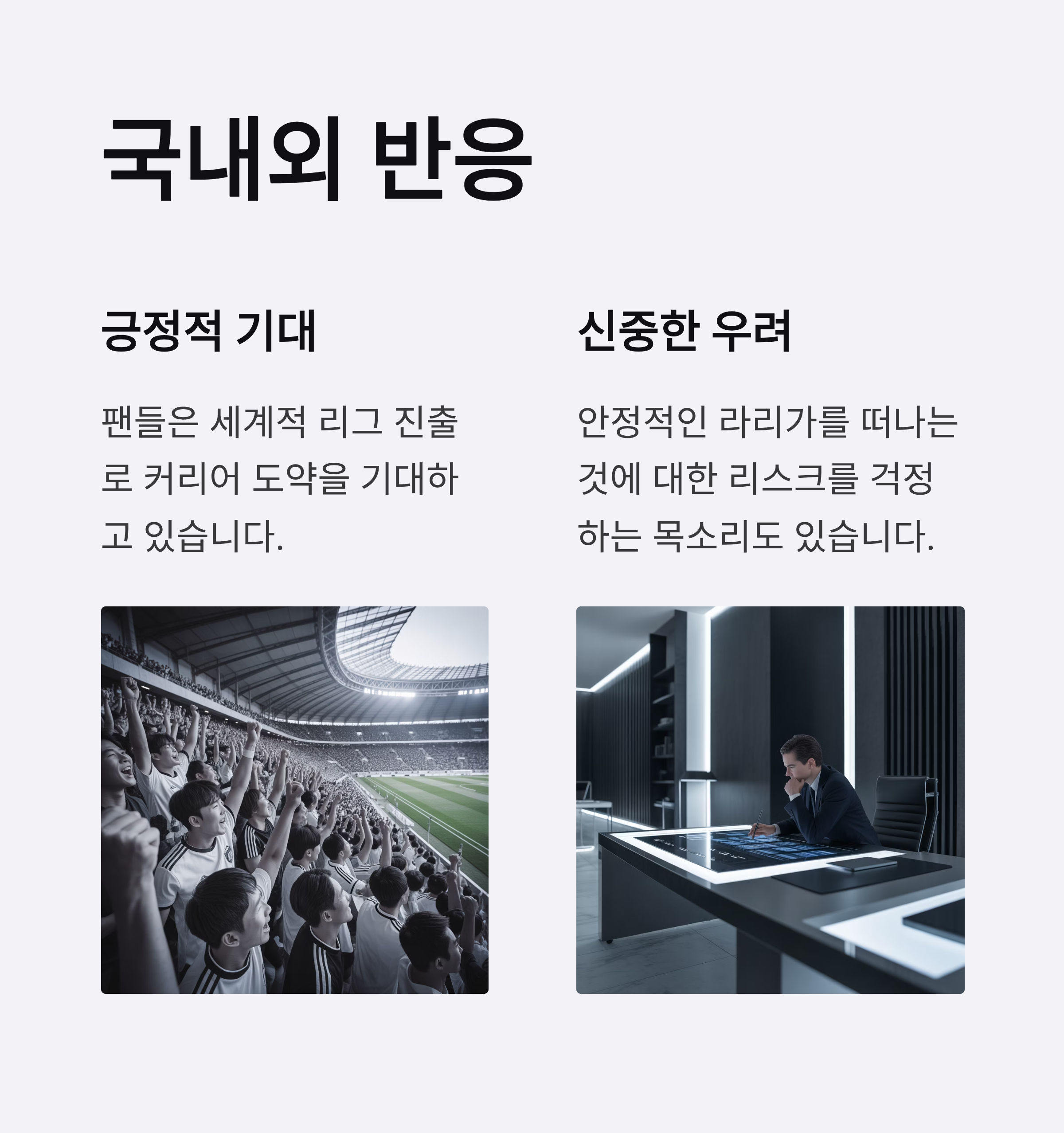 국내 팬들은 이강인의 EPL 진출을 긍정적으로 바라보고 있습니다. 특히 세계적인 리그로의 이적은 그의 커리어에 큰 도약이 될 수 있다는 기대가 큽니다. 반면 일부 팬들은 현재의 안정적인 라리가 팀에서 짧은 시간 안에 다른 리그로 옮기는 것이 리스크가 될 수 있다고 우려하고 있습니다. 한편, 유럽 이적 시장 전문가들은 애스턴 빌라뿐만 아니라 다른 EPL 팀들도 이강인을 주목하고 있다고 밝히며, 이적 협상이 단독 협상보다는 다자간 경쟁 구도로 전개될 가능성을 언급했습니다.