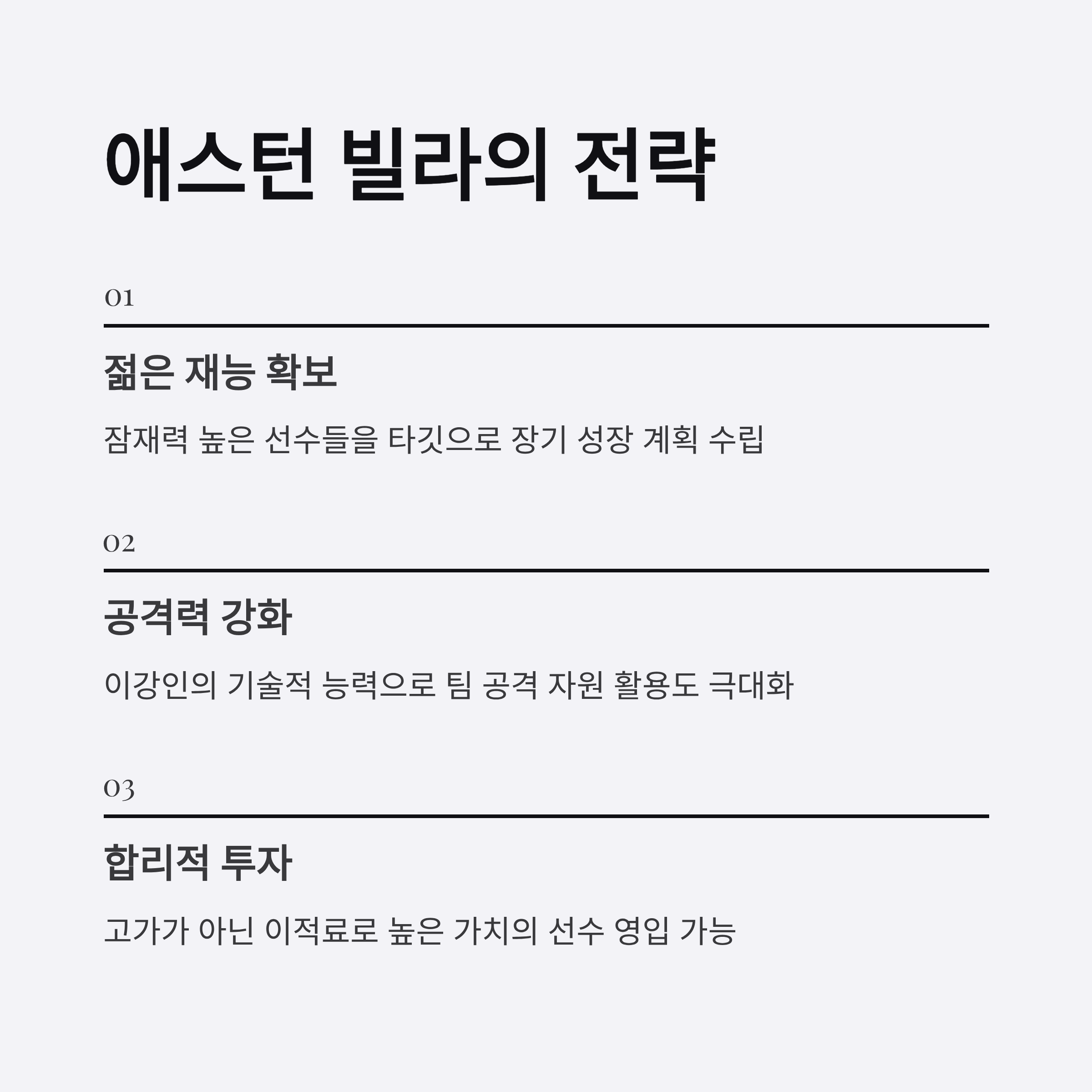 | A. 애스턴 빌라는 젊고 기술적인 자원을 추구하며, 이강인이 그 조건에 부합한다고 판단했습니다. 또한, 그의 공격 자원 활용 능력도 팀의 목표와 일치합니다. |