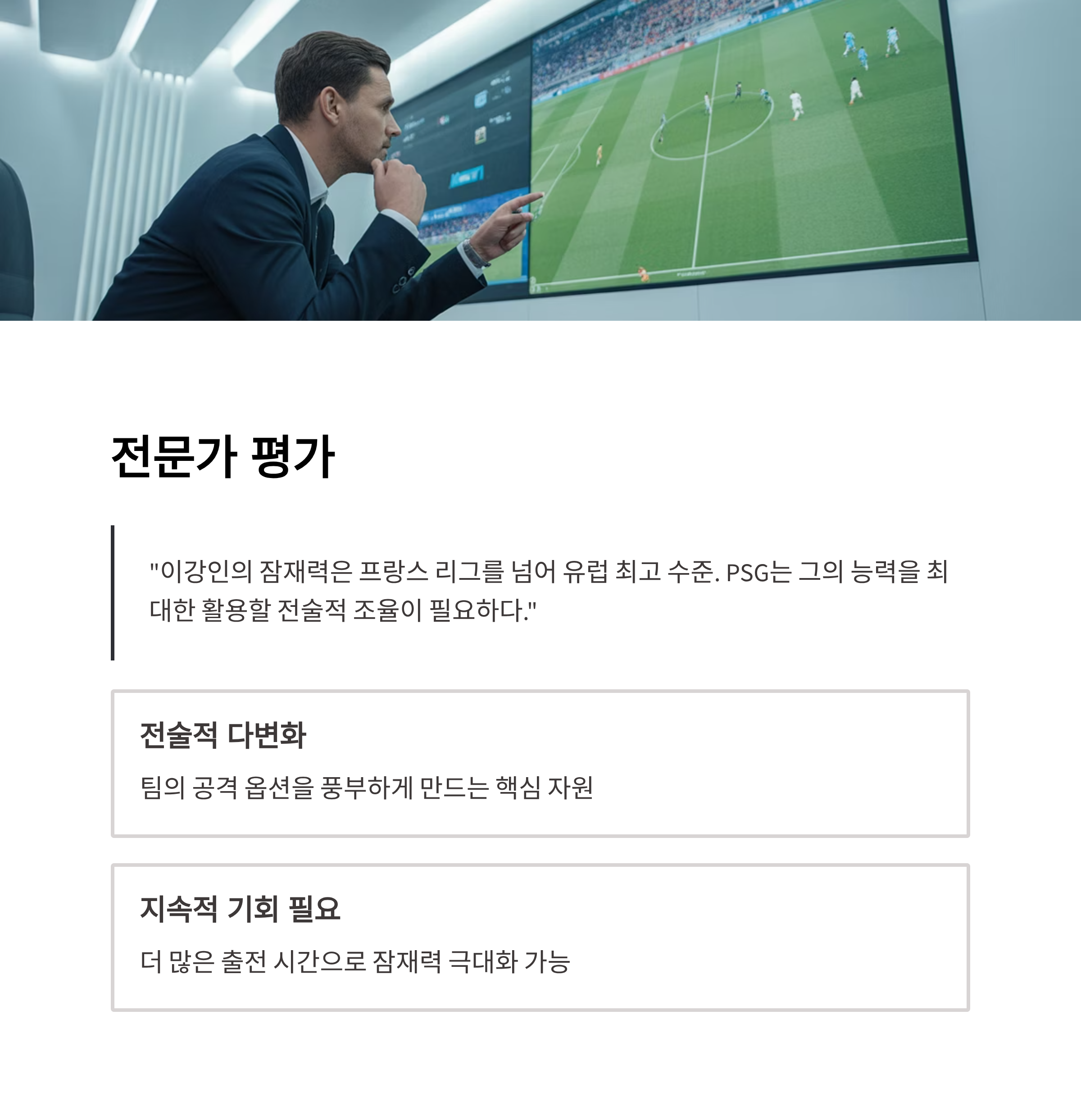 이강인은 단순히 한 경기에서의 좋은 성과를 남기는데 그치지 않고, 지속적으로 자신을 증명하고 있다. 이번 경기에서 드러난 세트피스 활용 능력과 공격 가담은 팀 내 입지를 강화시키기에 충분했다. 전문가들은 그의 이러한 기량이 프랑스 리그뿐 아니라 유럽 대항전, 나아가 국제무대에서도 충분히 통할 것이라고 긍정적으로 평가하고 있다. PSG는 이런 이강인의 잠재력을 최대한 발휘할 수 있도록 전술적인 조율과 지속적인 기회를 제공해야 할 것으로 보인다.