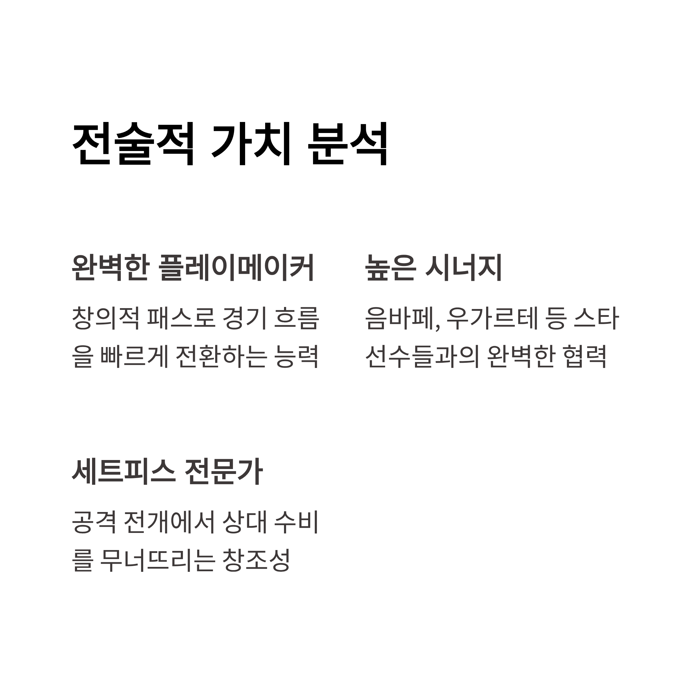 이번 경기에서는 후반 전략 변경을 이끌어내며 뛰어난 어시스트와 창의적인 플레잉을 보여줬습니다.