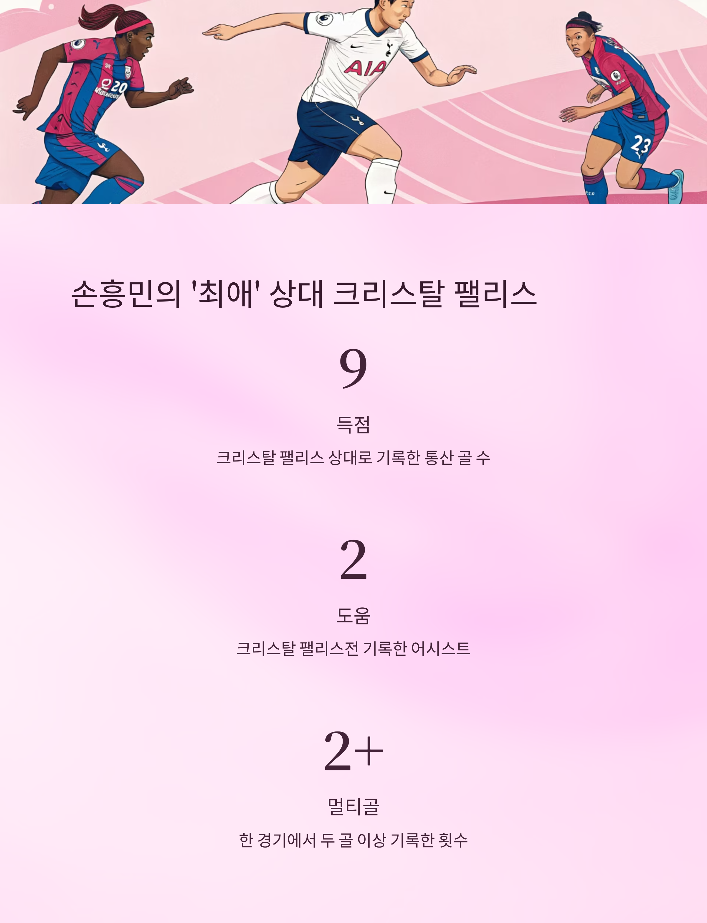 A. 손흥민은 크리스탈 팰리스를 상대로 9골 2도움을 기록하며, 매우 강한 면모를 보여온 상대입니다.