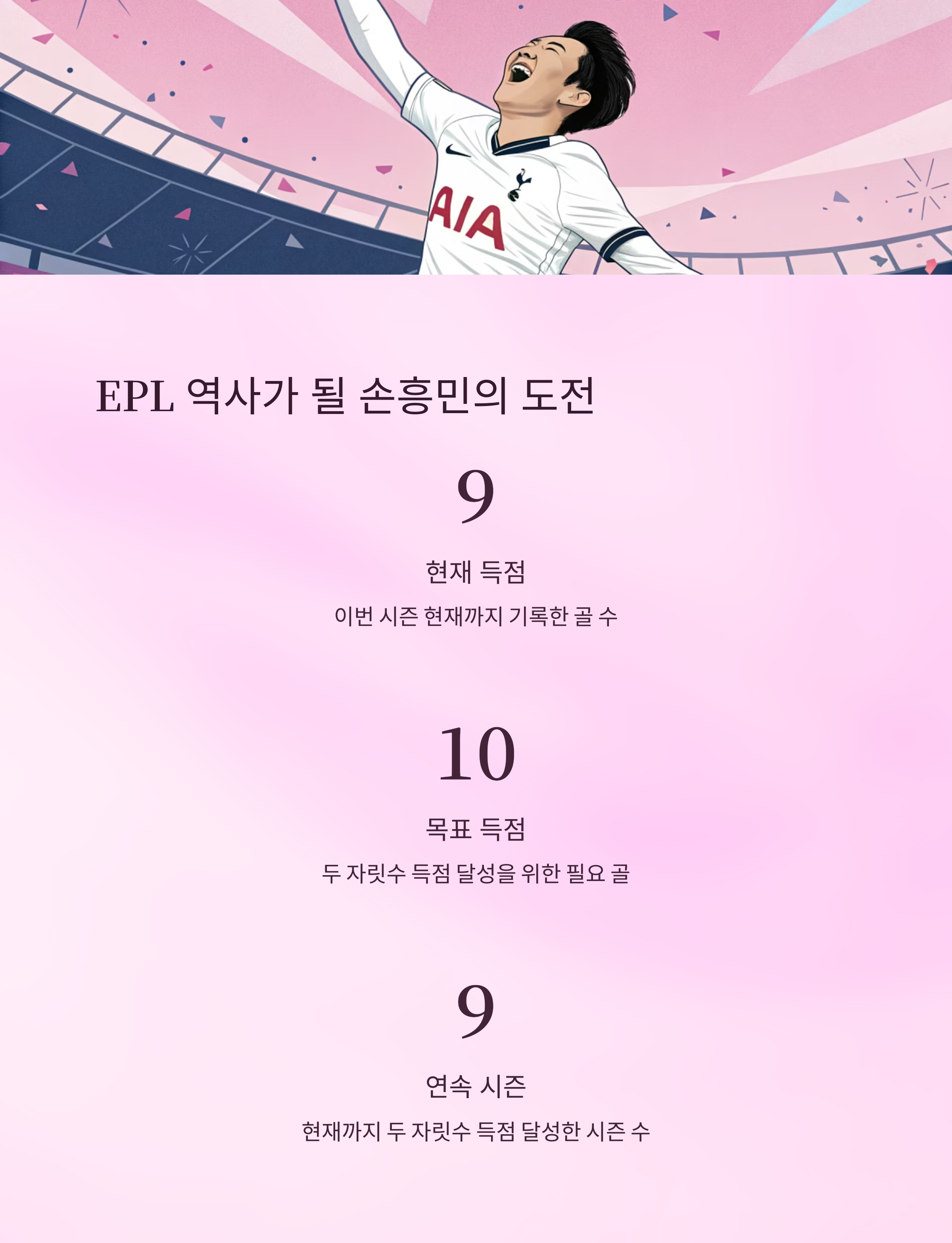 손흥민의 이번 득점 도전은 단지 수치의 문제가 아닙니다. EPL이라는 세계 최고의 무대에서 9시즌 연속 두 자릿수 득점을 기록한 선수는 극히 드물며, 이는 손흥민의 꾸준함과 실력을 상징하는 대기록입니다. 또한 이는 한국 축구 팬들에게도 큰 자부심이 되는 일이며, 손흥민의 글로벌 브랜드 가치를 한층 끌어올릴 수 있는 계기가 됩니다.