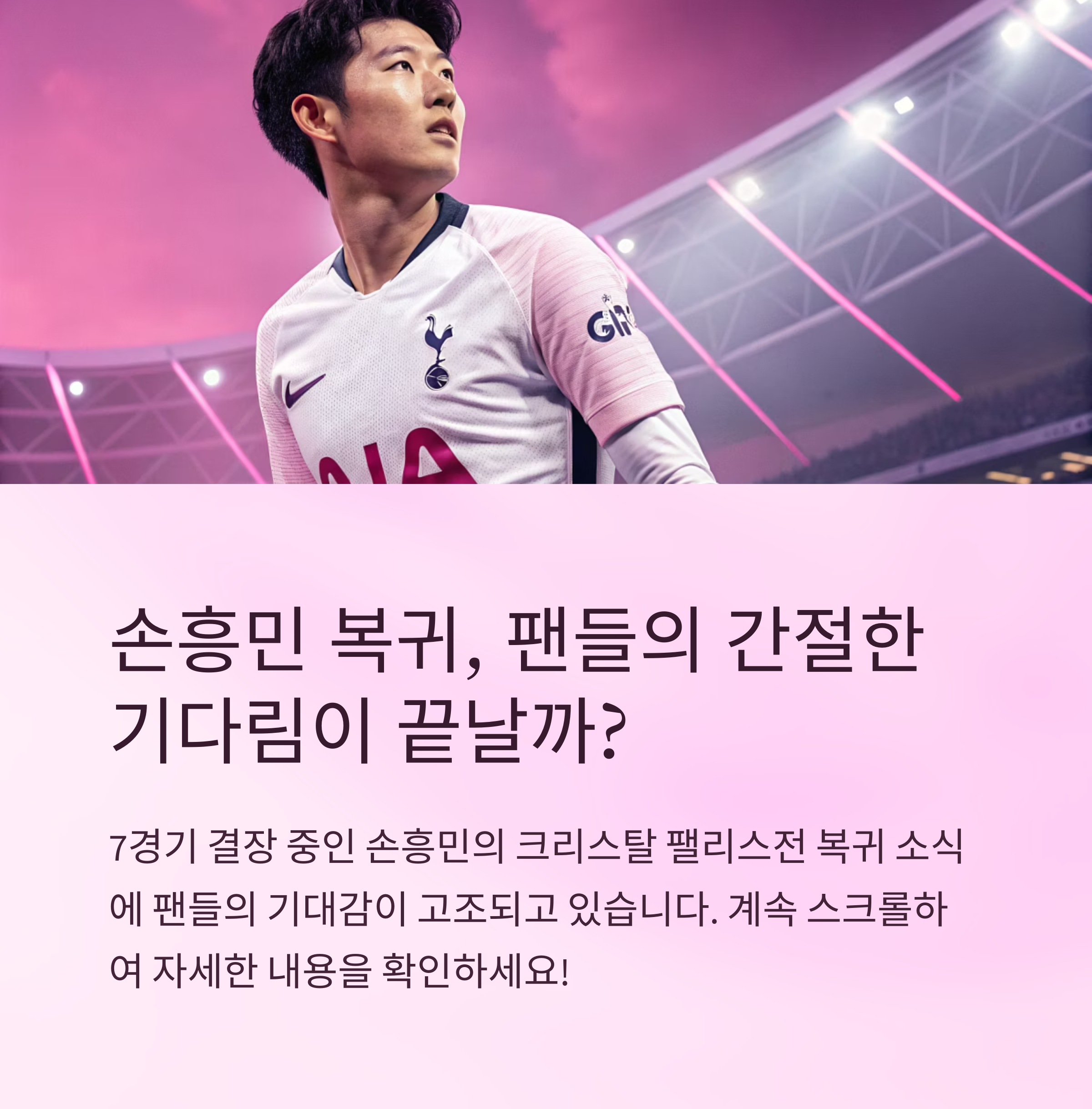 부상으로 인해 7경기 연속 결장했던 손흥민은 크리스탈 팰리스와의 경기를 통해 복귀할 가능성이 높아졌으며, 이번 경기는 단순한 복귀전이 아닌 매우 상징적인 의미를 갖습니다.