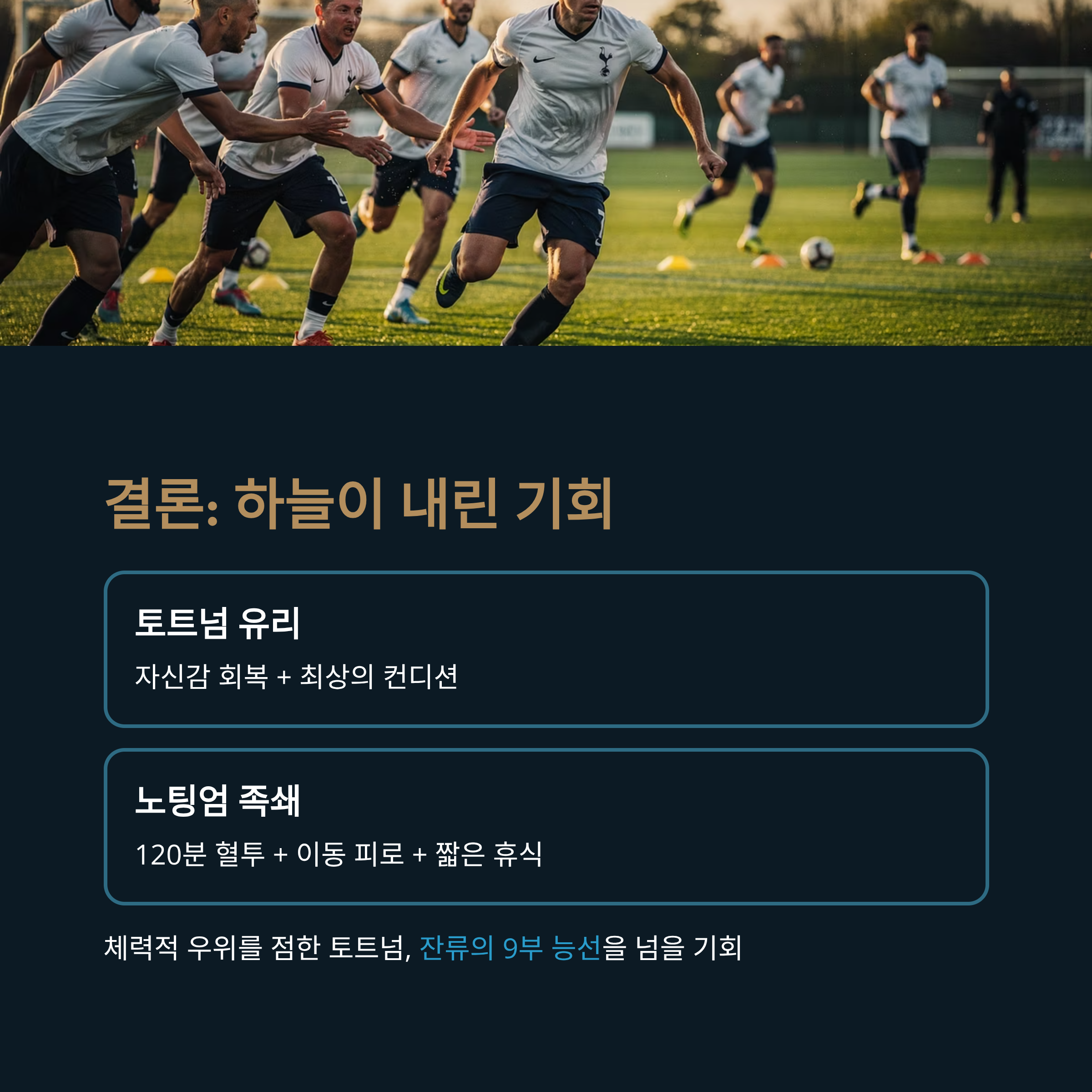 결론적으로 이번 '강등 결정전'의 추는 토트넘 쪽으로 크게 기울었다고 볼 수 있습니다. 현대 축구에서 체력과 회복은 경기 결과를 좌우하는 가장 중요한 변수 중 하나입니다. 노팅엄 선수단 전체에 퍼진 피로감은 경기 내내 그들의 발목을 잡을 가능성이 매우 높습니다. 특히 경기 후반으로 갈수록 체력적 우위를 점한 토트넘이 경기를 지배할 공산이 큽니다. 토트넘으로서는 이보다 더 좋을 수 없는 기회를 맞이한 셈입니다. 하늘이 내려준 것과 같은 이 기회를 놓친다면, 그 후폭풍은 상상 이상일 것입니다. 이제 모든 것은 토트넘의 발끝에 달렸습니다. 상대의 약점을 파고들어 승점 3점을 획득하고 프리미어리그 잔류의 9부 능선을 넘을 수 있을지, 전 세계 축구 팬들의 이목이 집중되고 있습니다.