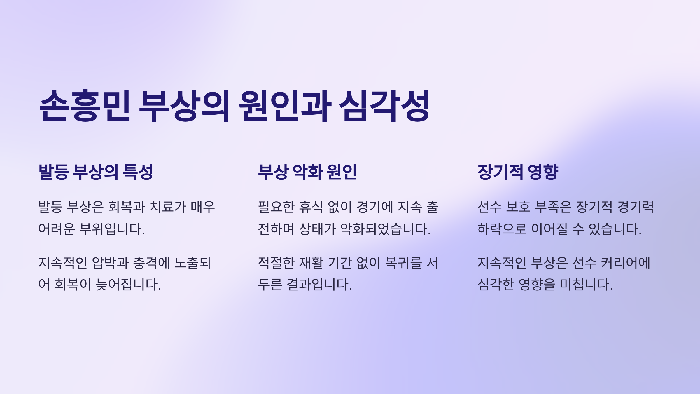 3. 손흥민의 부상은 치료가 어려운 발등 부위로, 지속적인 출전 강행이 부상 악화를 유도한 원인으로 분석됩니다.