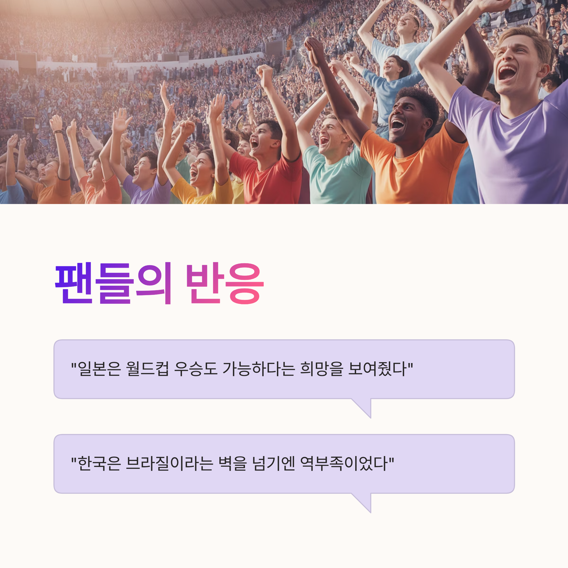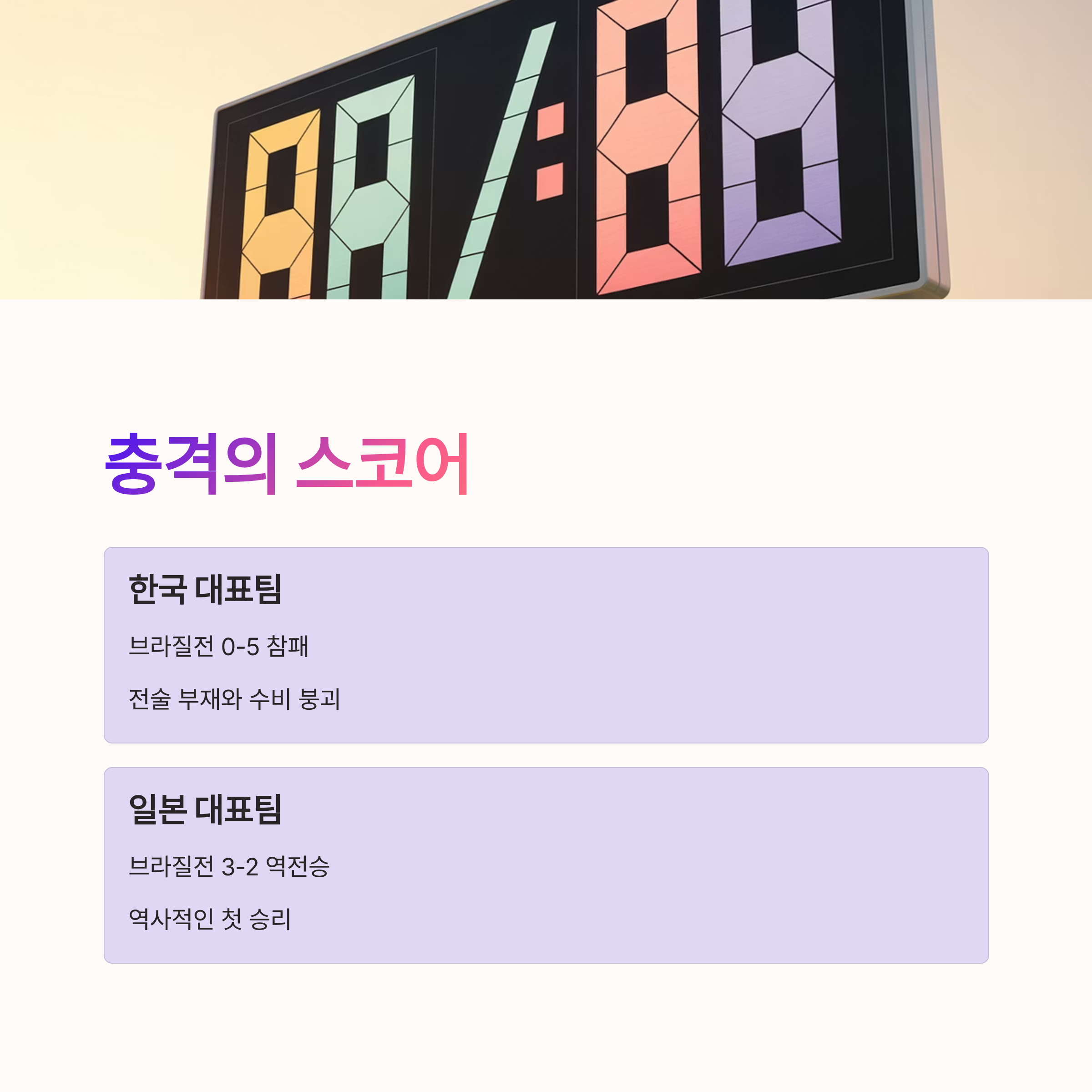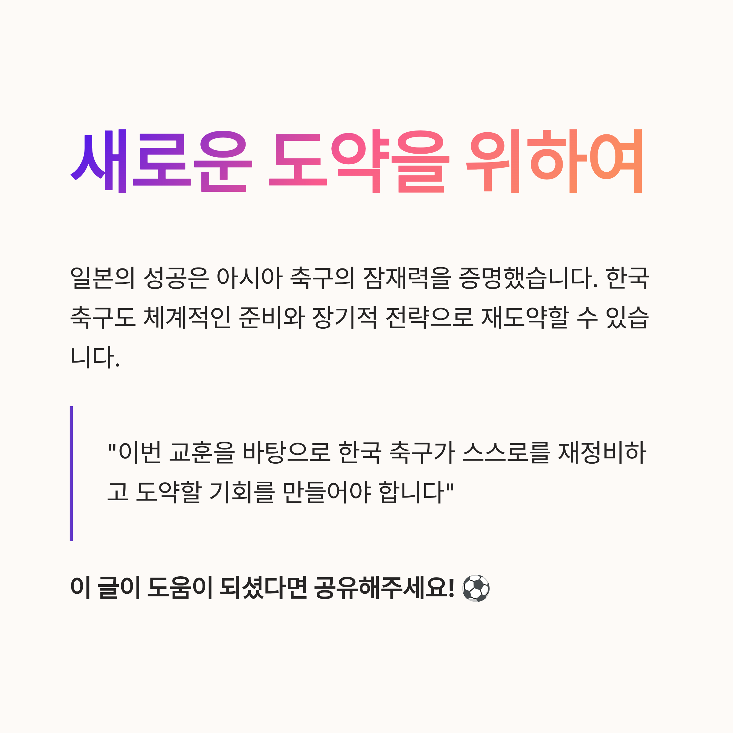 특히, 일본의 승리는 아시아 축구의 잠재력을 보여주는 상징적인 사건이었고, 이는 한국 축구 또한 새로운 도전 과제로 삼아야 할 것이다. 체계적이고 장기적인 발전 전략, 국제적 경험을 쌓을 선수 육성 시스템, 그리고 감독의 전략적 유연성이 필수다. 이 교훈을 바탕으로 한국 축구가 스스로를 재정비하고 도약할 수 있는 기회를 만들어야 한다.