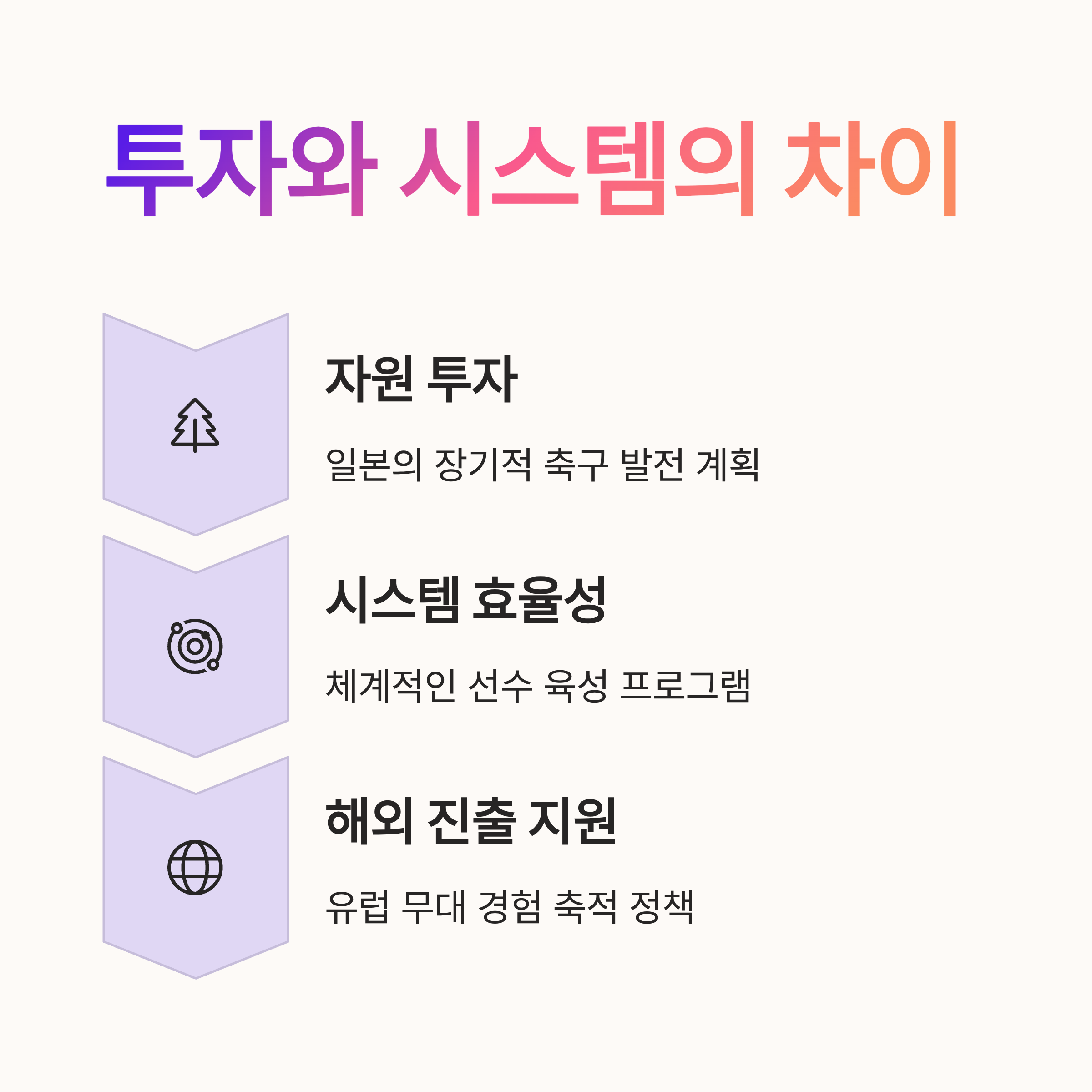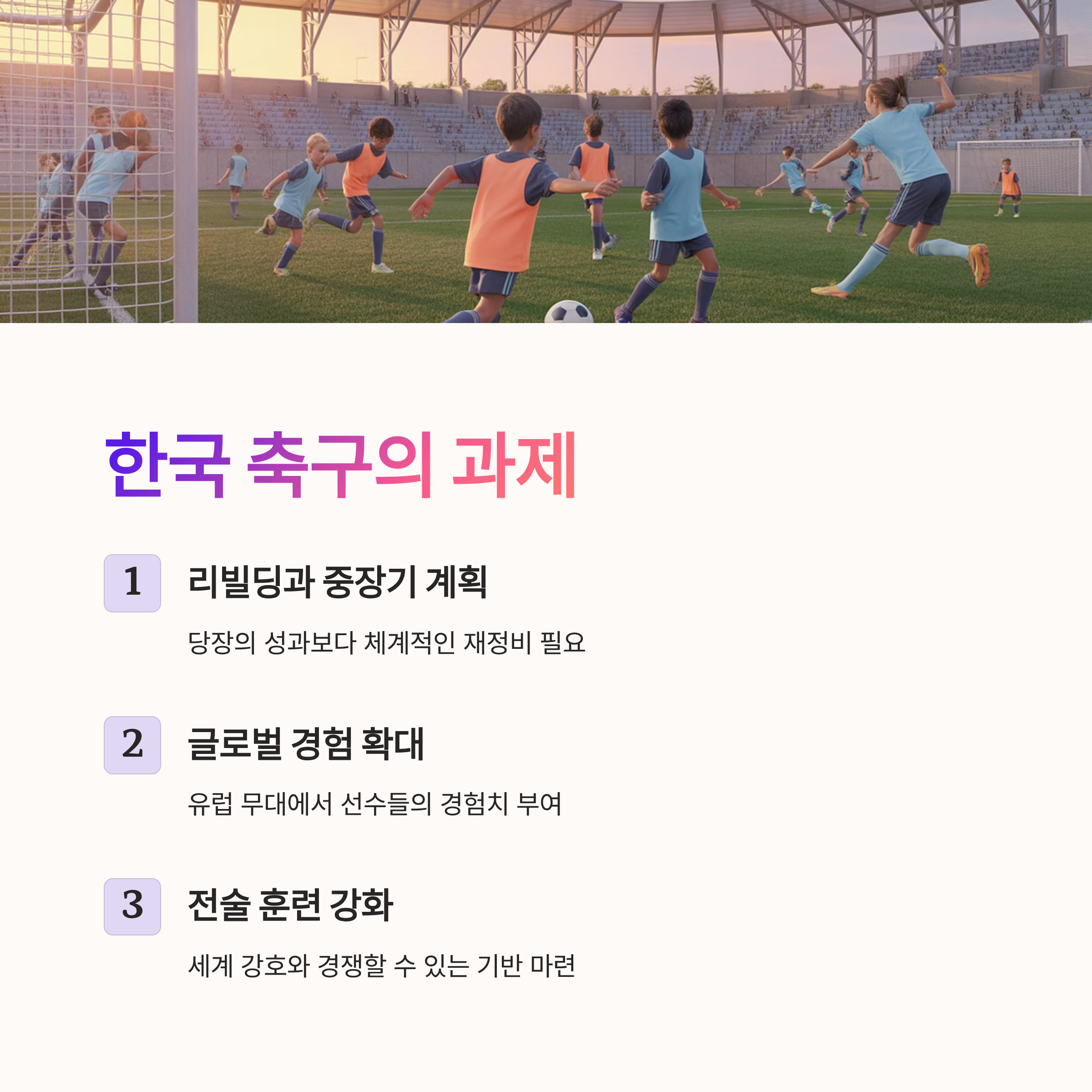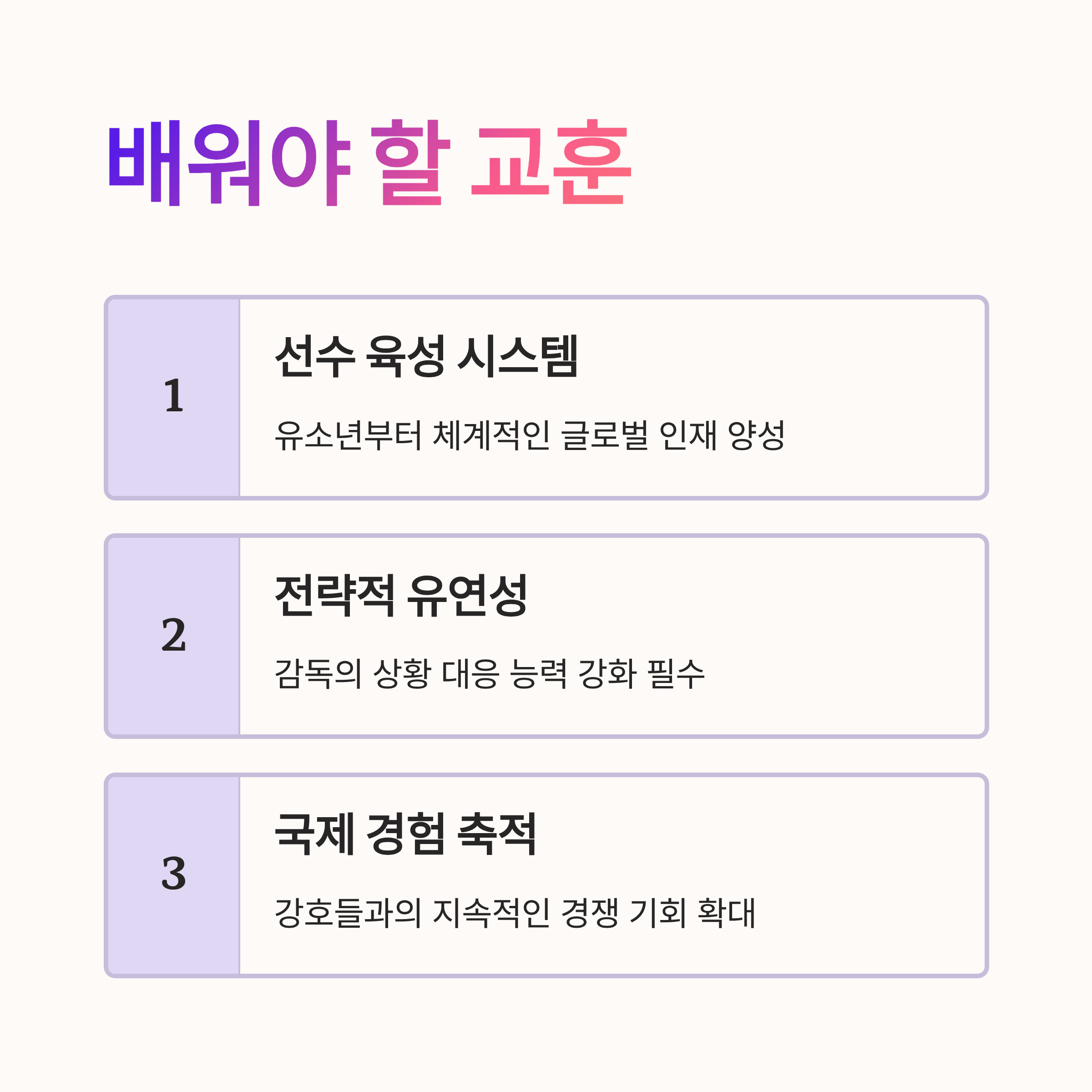 한국 축구는 당장의 성과에 연연하기보다는 리빌딩과 중장기적 계획이 필요하다. 일본 스타일에서 배울 점은 명확하다: 선수들에게 유럽 무대와 같은 뛰어난 환경에서 경험치를 부여하고, 체계적인 전술 훈련으로 세계 강호들과 경쟁할 수 있는 기반을 마련해야 한다.