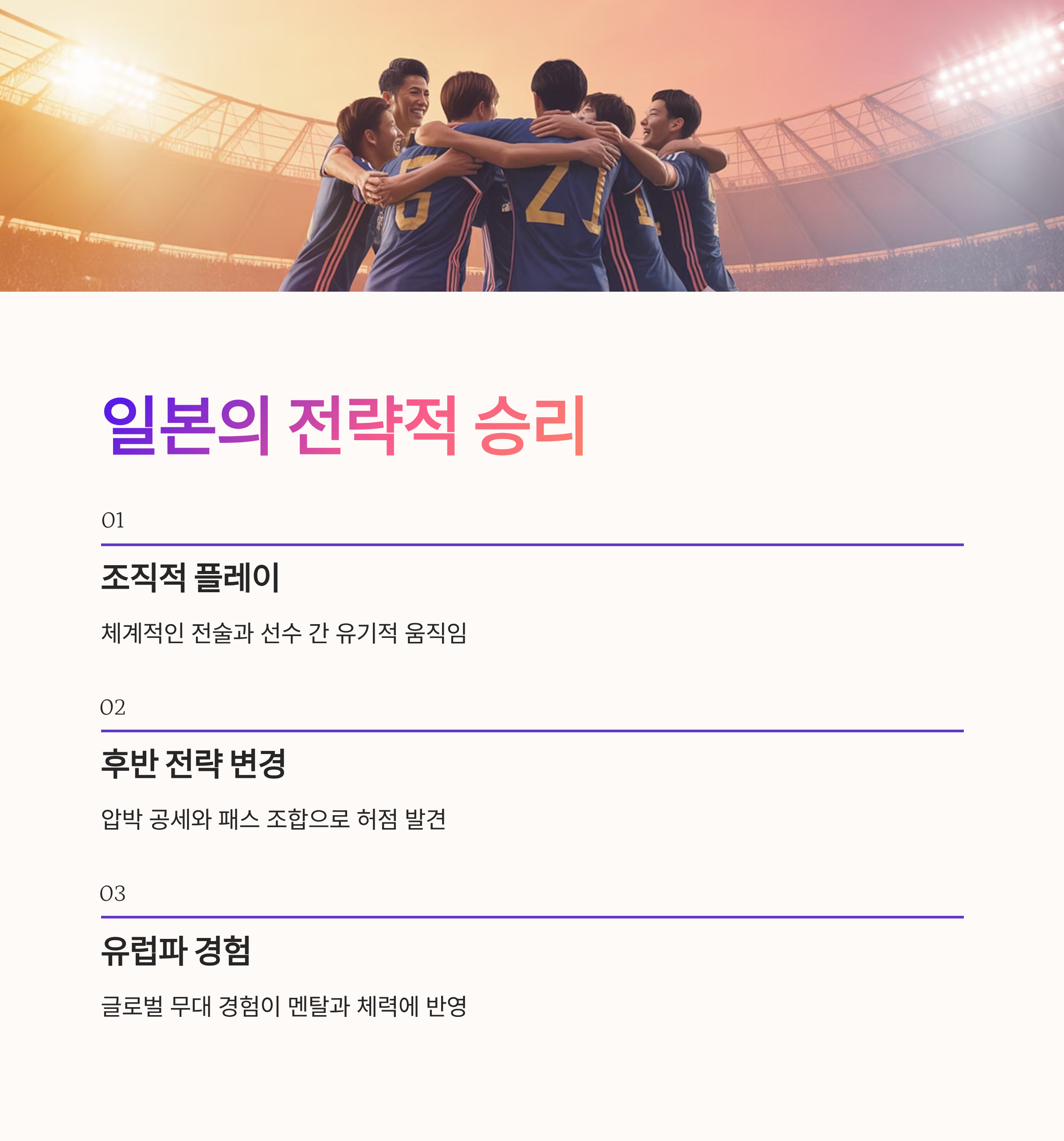 A. 일본은 장기적인 축구 발전 계획과 해외 진출 선수 육성 정책에 집중해왔다. 유럽 리그 경험이 많은 선수들이 중심이 되어 강호들과의 경쟁력도 상승했다.