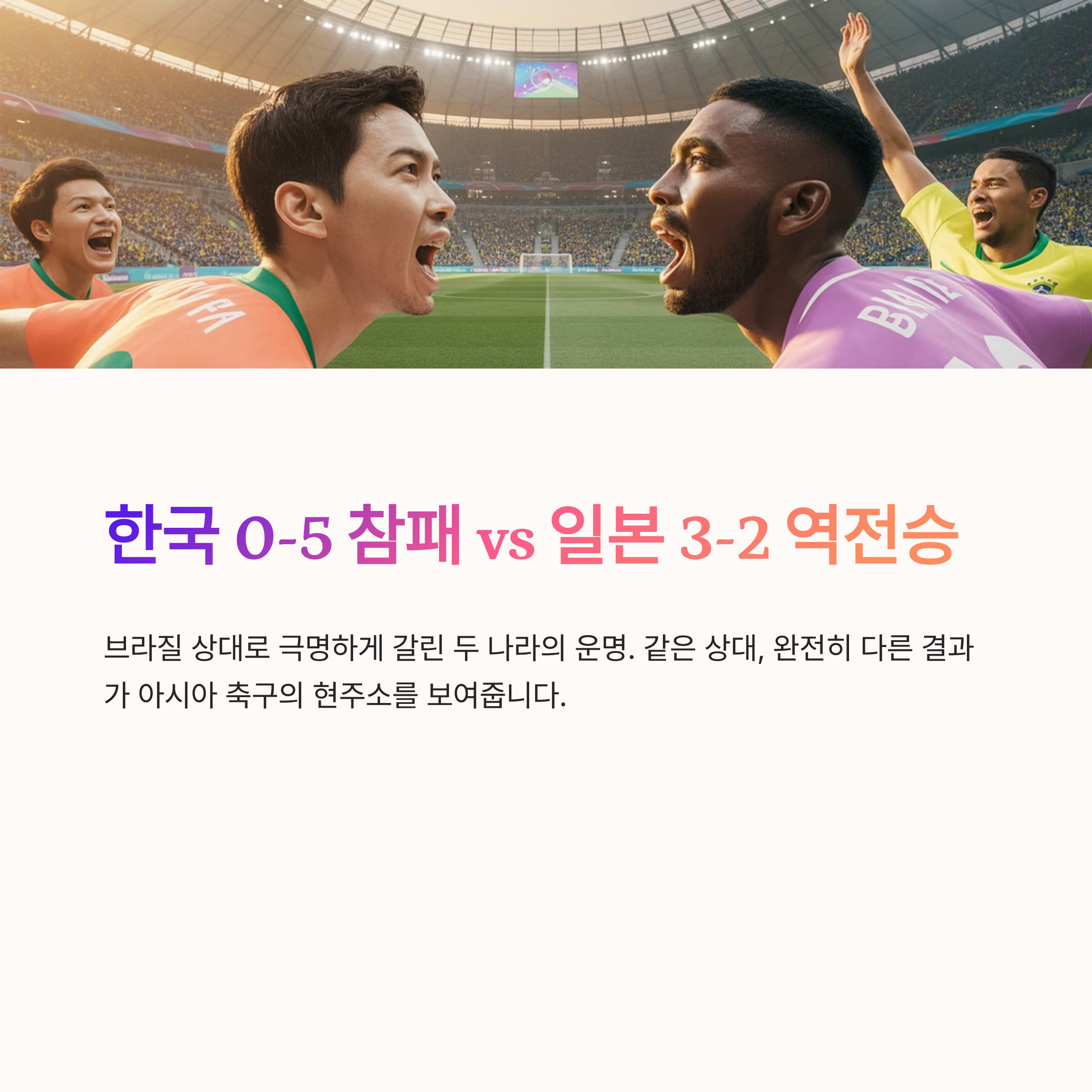 지난 10월 축구 국가대표 A매치 평가전에서 한국과 일본 두 팀은 세계 최강 브라질 대표팀과 차례로 맞붙으며 상반된 결과를 만들어냈다. 대한민국 축구대표팀은 브라질 상대로 0-5라는 참혹한 대패를 기록했지만, 일본 대표팀은 3-2 역전승이라는 역사적인 결과를 낳았다. 이 경기는 두 나라의 축구 역량 차이를 분명히 드러내며 아시아 축구팬들에게 큰 충격과 화제를 불러일으켰다.