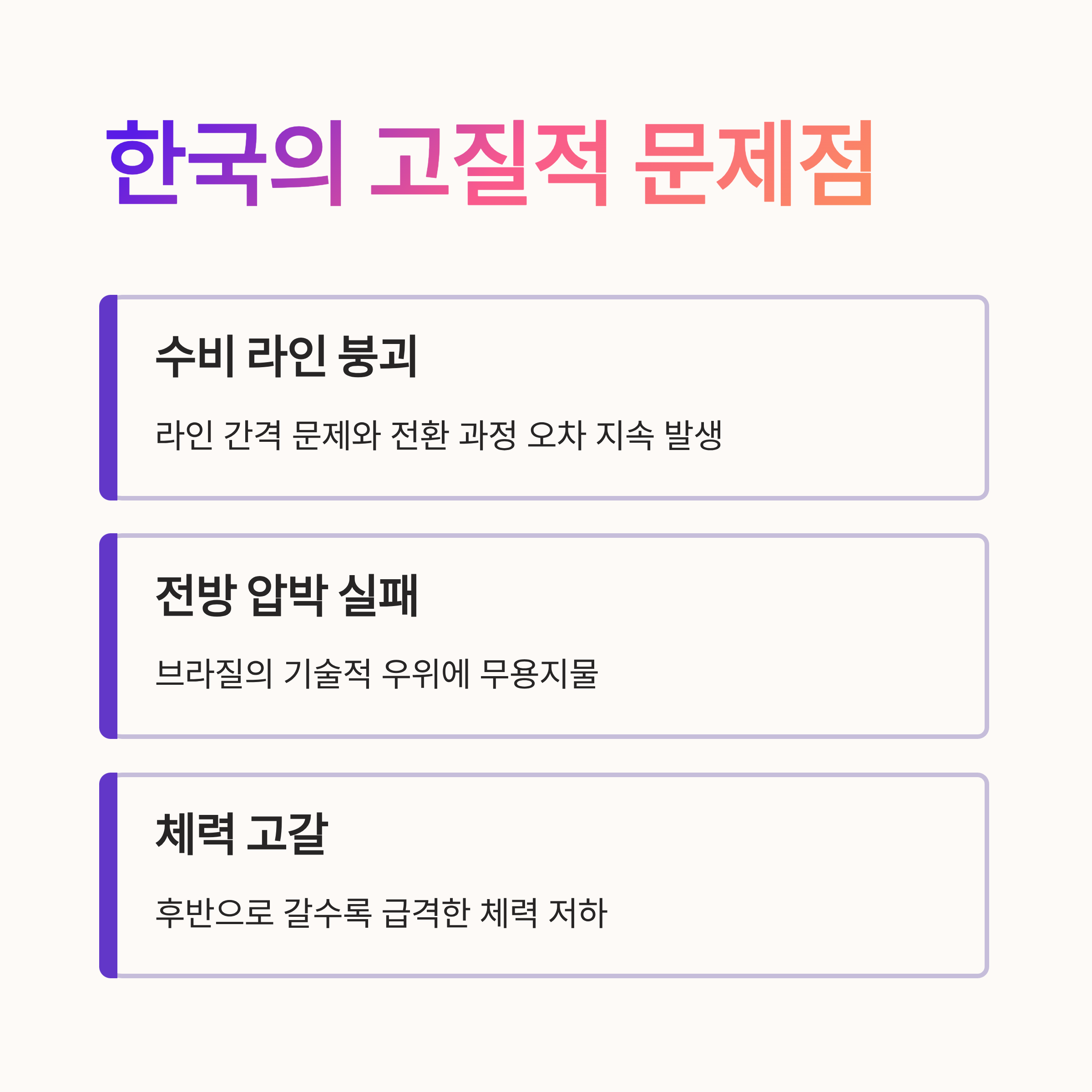A. 한국 대표팀은 전술의 유연성과 체계적인 조합이 부족하며, 특히 세계적인 강팀에 맞서기 위한 체력과 멘탈적인 보완이 필요합니다.