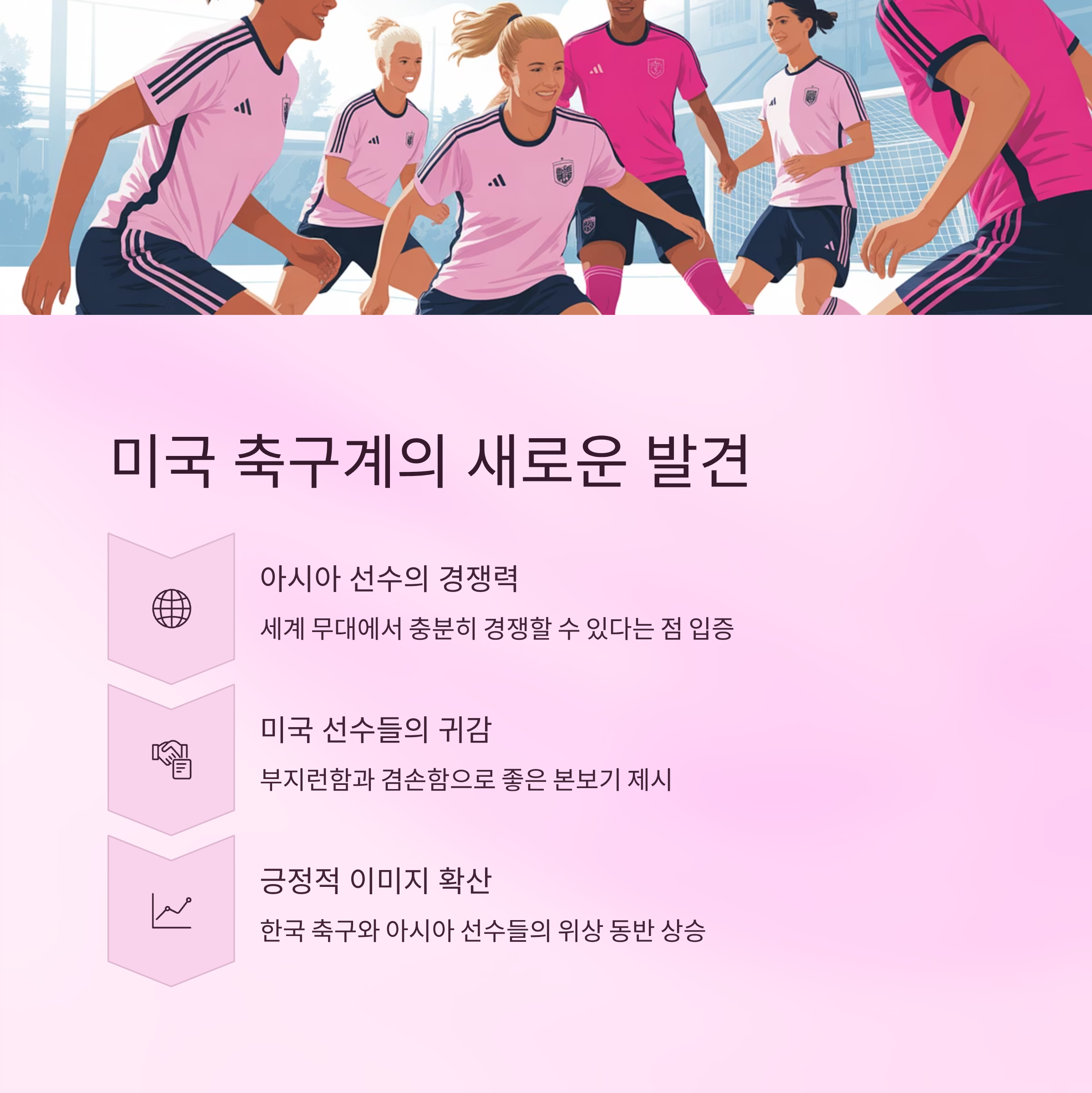 미국 축구계는 손흥민을 통해 아시아 축구 선수들이 세계적 무대에서도 충분히 경쟁력을 가질 수 있다는 점을 확인했습니다. 특히 그의 부지런함과 겸손함은 미국 선수들에게도 좋은 귀감이 되고 있으며, 이는 손흥민 개인뿐 아니라 한국 축구와 아시아 선수들의 긍정적인 이미지를 함께 높이는 효과를 가져오고 있습니다.