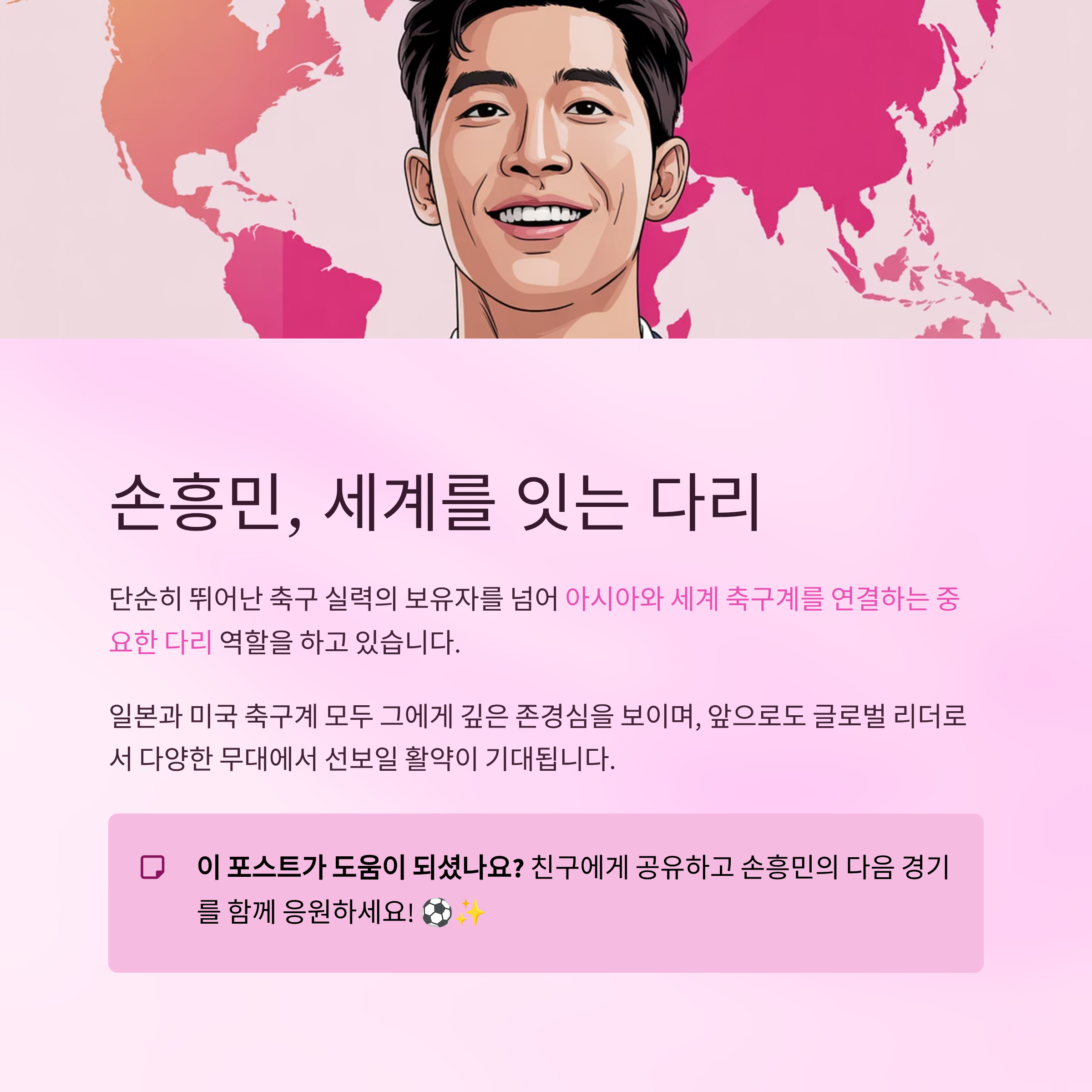 손흥민은 단순히 뛰어난 축구 실력의 보유자를 넘어 아시아와 세계 축구계를 연결하는 중요한 다리 역할을 하고 있습니다. 일본과 미국 축구계 모두 그에게 깊은 존경심을 보이며, 손흥민은 그 속에서도 자신의 위치를 공고히 다지고 있습니다. 앞으로도 글로벌 리더로서 손흥민이 다양한 무대에서 선보일 활약이 기대됩니다.