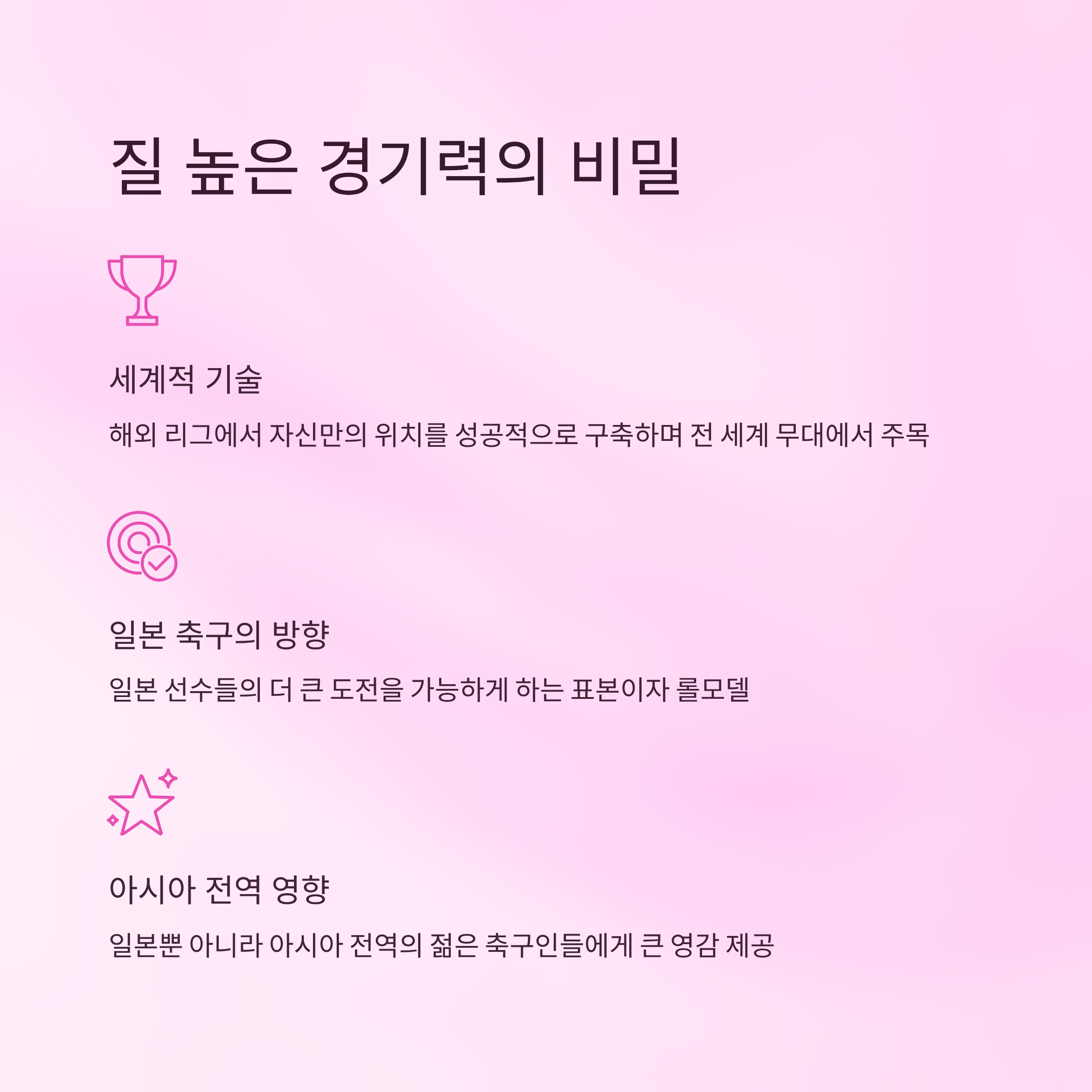 특히 손흥민은 질 높은 경기 플레이와 더불어 해외 리그에서 자신만의 위치를 성공적으로 구축하며 전 세계 무대에서 주목받고 있습니다. 이는 일본 축구가 나아갈 방향 또한 제시하며, 일본 선수들의 더 큰 도전을 가능하게 하는 표본이 되고 있습니다.
