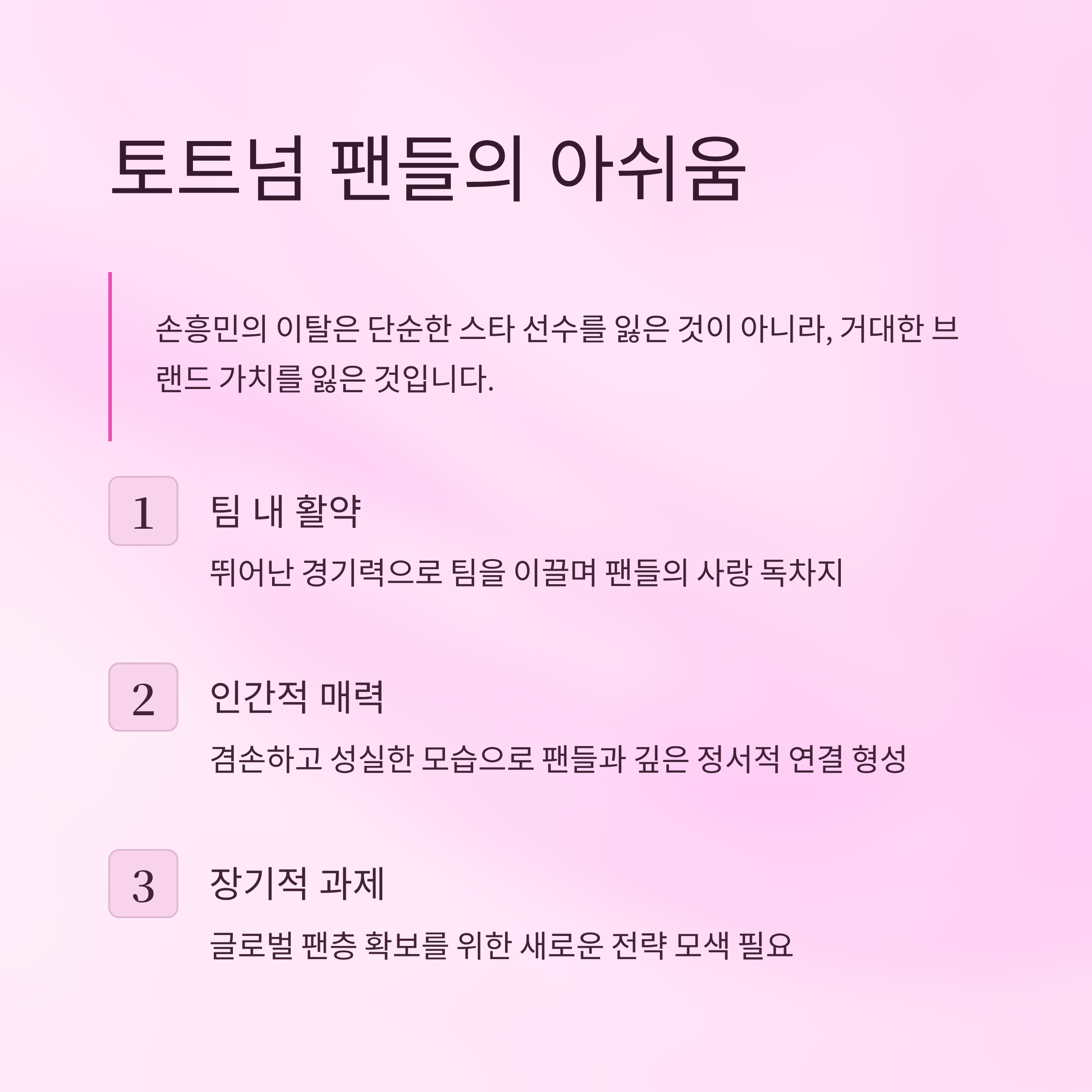 토트넘 팬들 대부분은 손흥민의 팀 내 활약뿐만 아니라 인간적 매력을 이유로 그를 지지합니다. 이런 정서적 연결은 팬 상품 구매로 이어지는 중요한 요소로 작용했습니다. 따라서 향후 토트넘은 손흥민과 같은 절대적 영향력을 가진 선수를 대체하거나, 글로벌 팬층을 다시 확보하는 장기적 전략을 모색해야 할 것으로 보입니다.