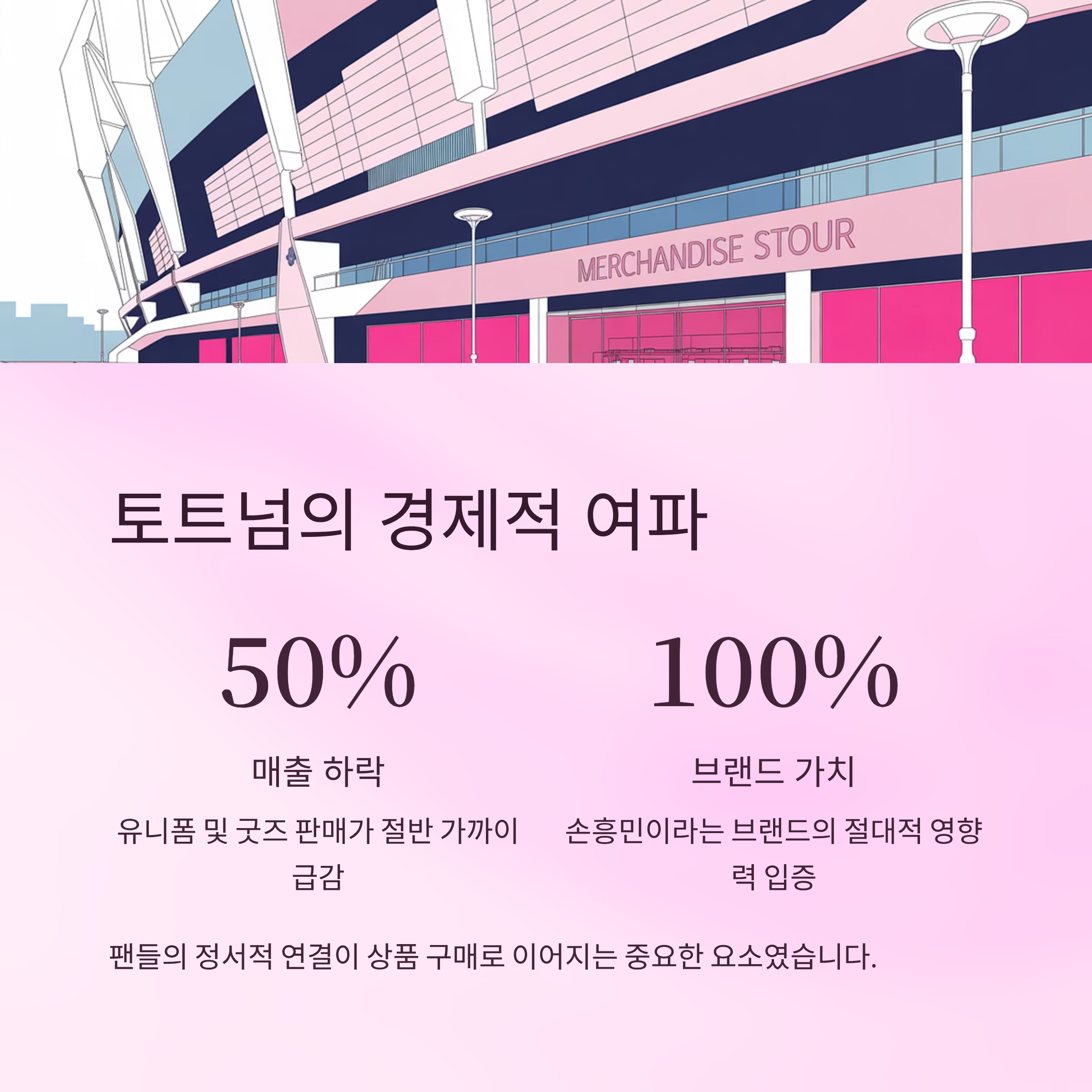 | A. 손흥민의 이적 이후 팬 상품 판매 매출이 절반 가까이 감소하며, 충분한 대체제가 없는 현실에서 상업적 손실이 발생했습니다. |