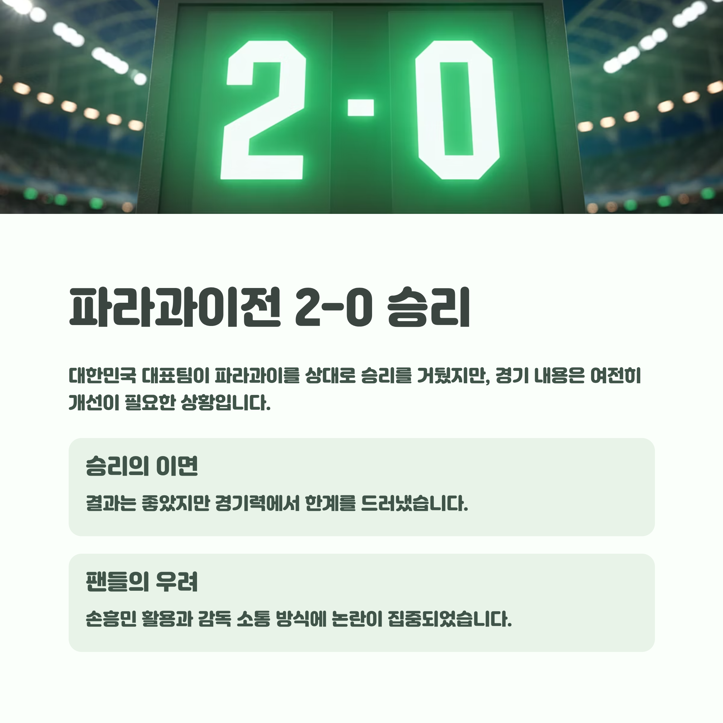 1. 대한민국 축구 국가대표팀은 파라과이와의 경기에서 2대 0 승리를 거두었으나, 전반적인 경기 내용은 개선이 필요하다는 평가를 받았습니다.