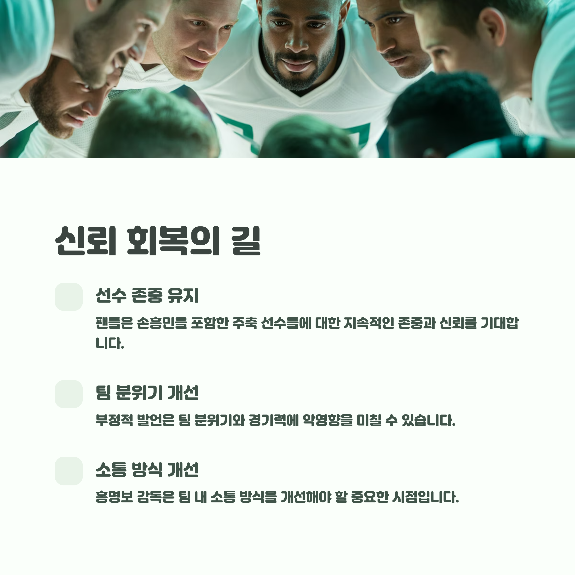 또한, 팬들은 손흥민 선수를 포함한 주축 선수들에 대한 존중과 신뢰가 지속적으로 유지되기를 기대하고 있습니다. 만약 감독의 발언이나 행동이 선수들에게 부정적인 여론을 가지게 한다면, 이는 팀 분위기와 경기력에 부정적인 영향을 미칠 수 있습니다. 홍명보 감독은 이러한 점을 인지하고 팀 내 소통 방식을 개선해야 할 시점입니다.