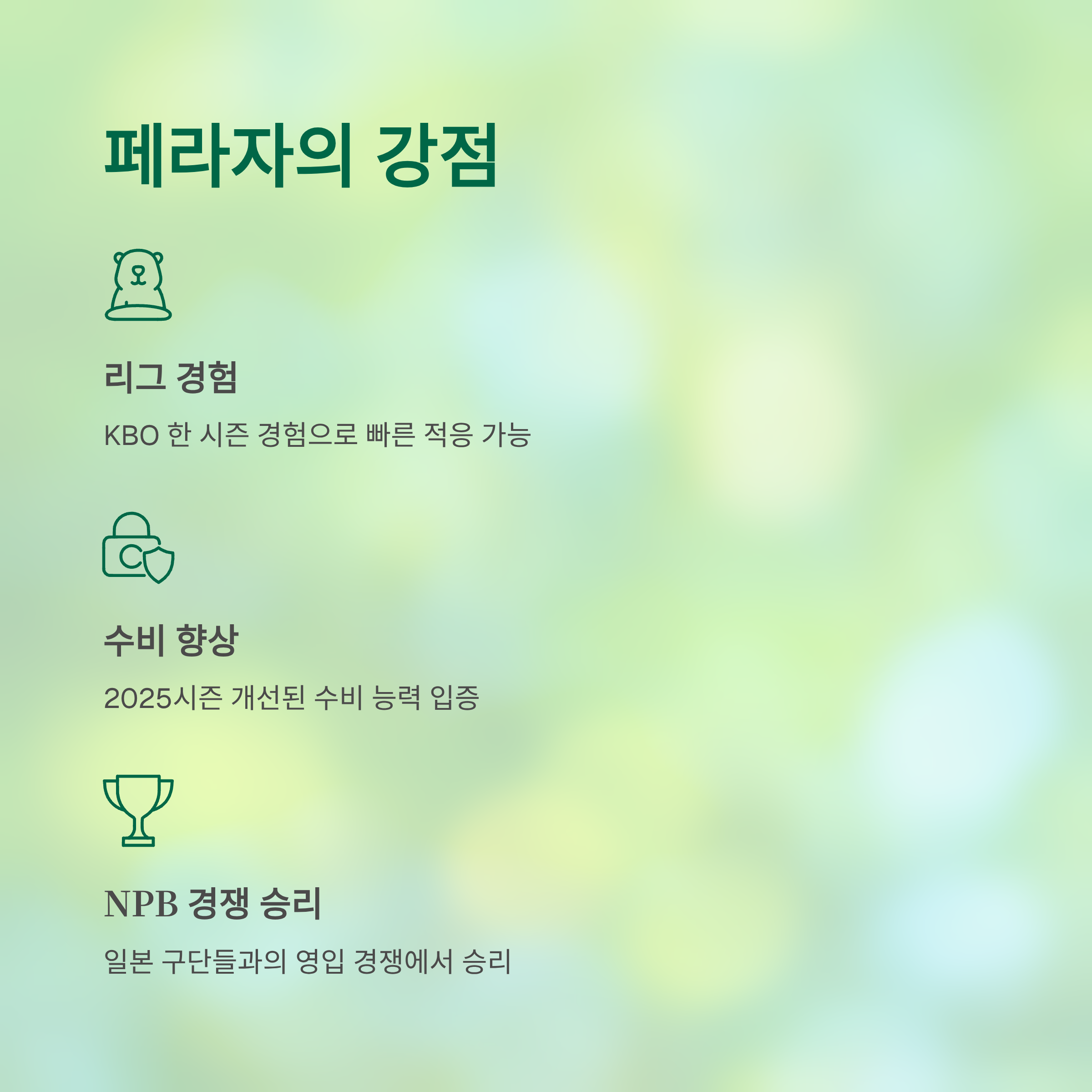 페라자는 KBO 리그에서 이미 한 시즌을 경험한 바 있어, 타자 적응 문제에서 큰 우위를 점할 것으로 보인다. 2025년 시즌 동안 개선한 수비 능력과 타율 생산성은 클린업 라인의 중심으로 자리 잡을 가능성을 열어준다. 또, 페라자의 영입에 열을 올렸던 일본 프로야구(NPB) 구단들과의 경쟁에서 승리한 것은 한화에게 큰 의의를 남겼다.