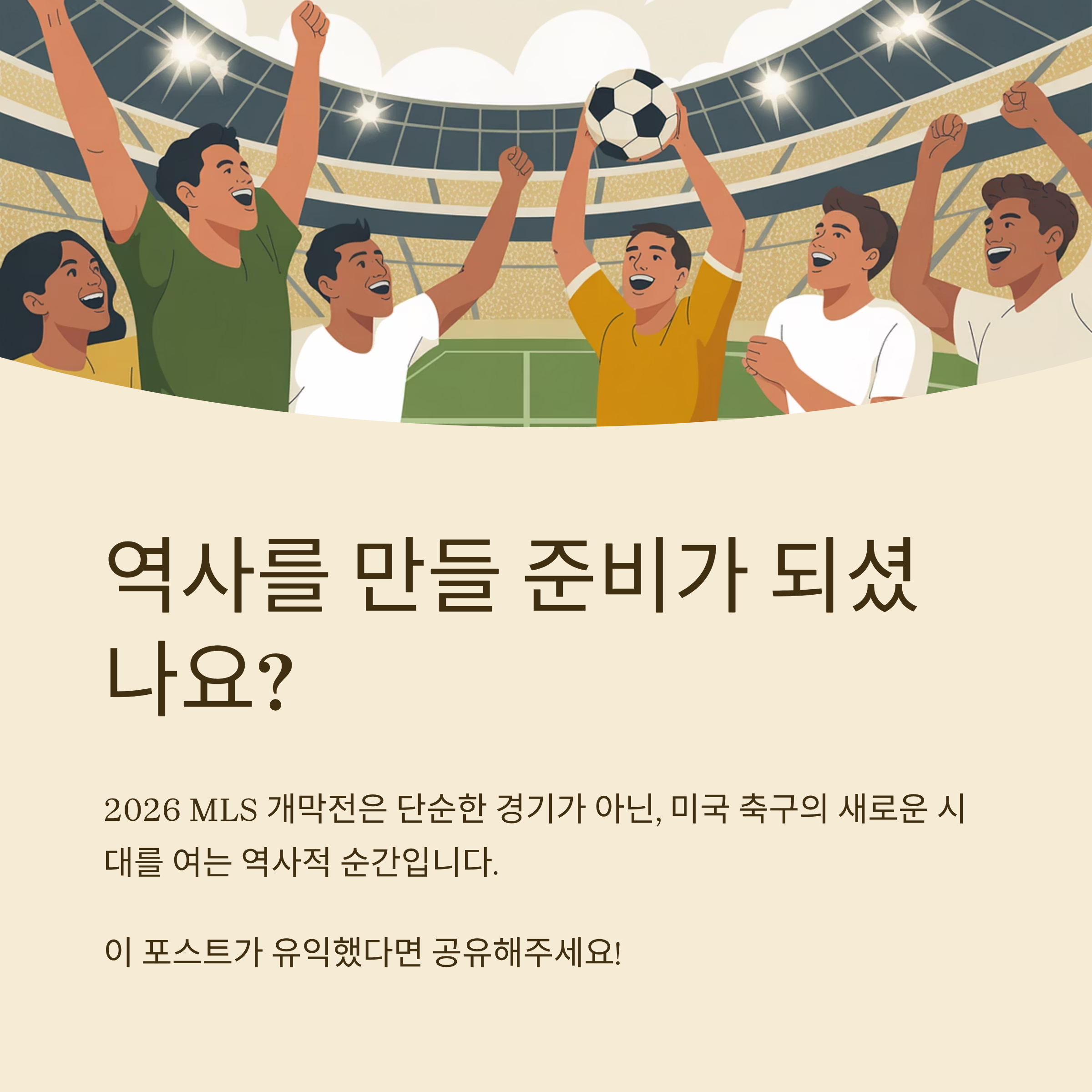 2026 MLS 시즌 개막전은 단순히 리그 시작을 알리는 것을 넘어 미국 축구의 새로운 시대를 여는 이벤트로 평가받고 있습니다. 손흥민과 메시라는 전 세계적으로 사랑받는 두 선수의 맞대결은 스포츠 팬뿐 아니라 다양한 계층의 이목을 집중시키고 있습니다. 경기 자체가 가진 상징 대신, 이를 둘러싼 경제적, 문화적, 그리고 글로벌한 스포츠 마케팅 효과는 MLS가 글로벌 리그로 성장하는 데 중요한 영향을 미칠 것입니다. 월드컵의 열기도 이 함께하며, 미국이 축구 강국으로 도약하는 발판이 될 것으로 보입니다.