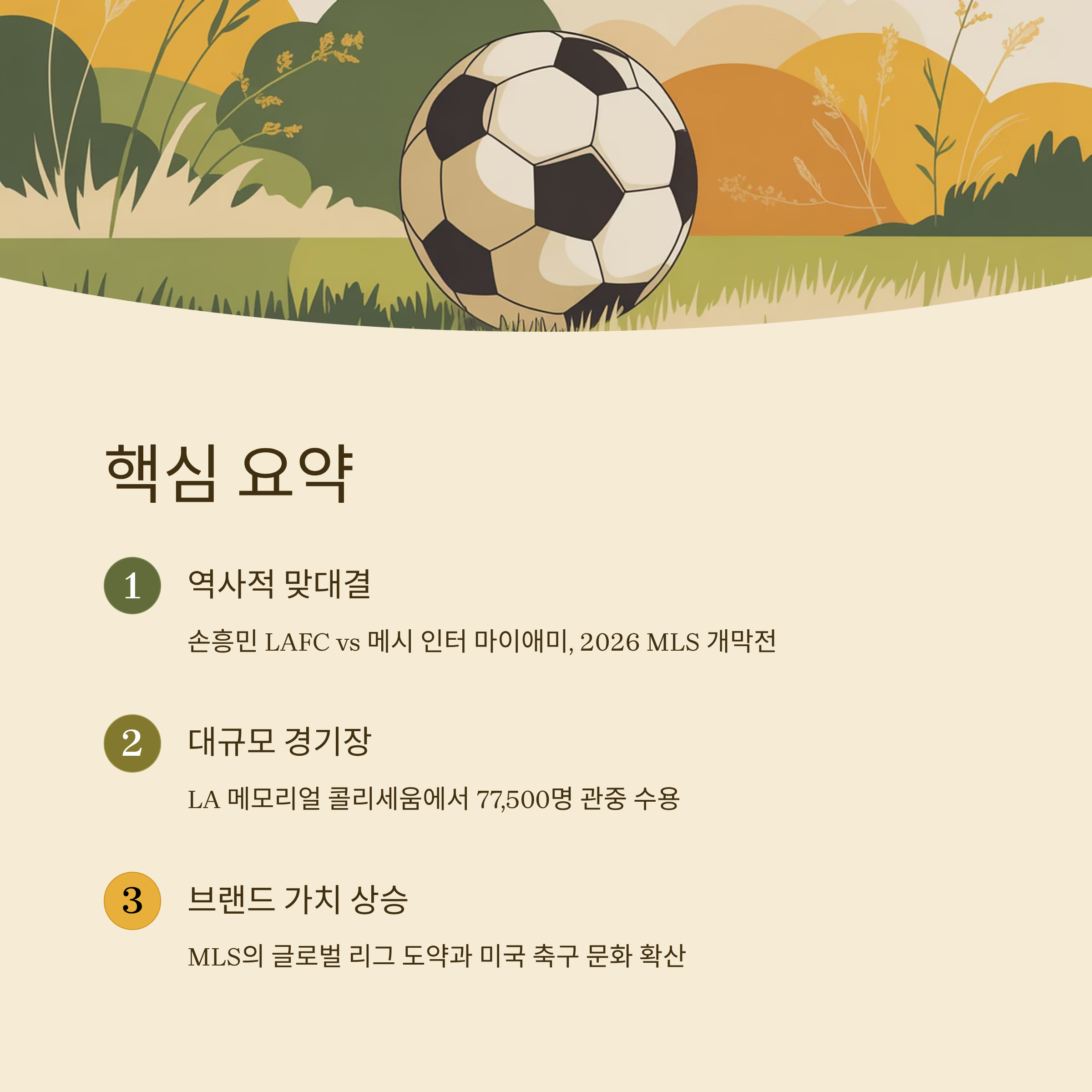 관련 태그 MLS, 손흥민, 메시, 2026 FIFA 월드컵, LA 메모리얼 콜리세움, 미국 축구, 리그 흥행, 빅매치, 글로벌 스포츠