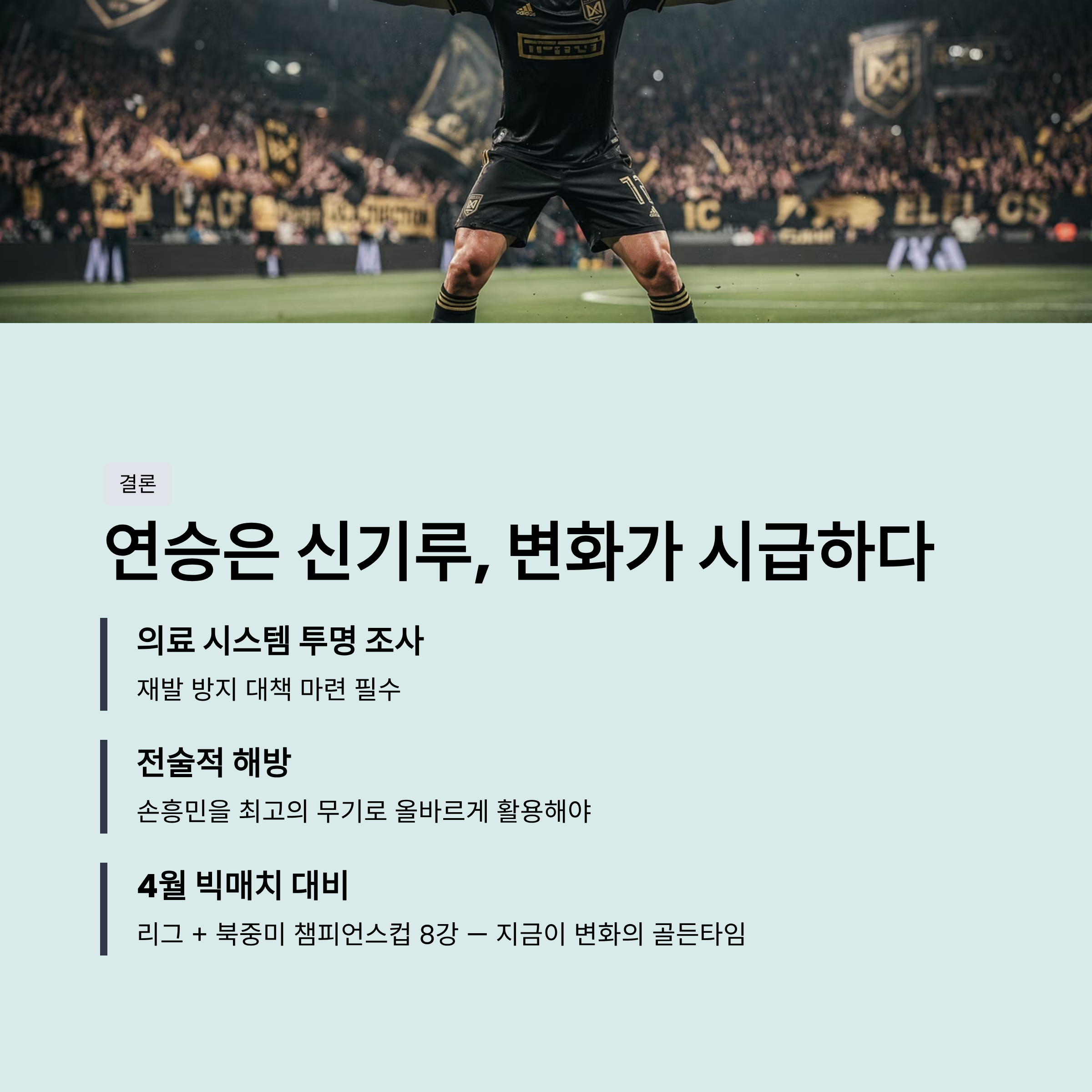 이와 더불어 구단은 이번 의료 과실 사태를 투명하게 조사하고 재발 방지 대책을 마련해야 합니다. 신뢰를 잃은 의료 시스템 아래에서는 어떤 선수도 최상의 경기력을 발휘할 수 없습니다. 4월부터는 리그와 북중미 챔피언스컵 8강 등 중요한 일정이 기다리고 있습니다. LAFC가 당장의 성적에 안주하지 않고, 손흥민이라는 최고의 무기를 올바르게 활용하는 지혜로운 변화를 보여주길 기대합니다. 팬들은 답답한 '꾸역승'이 아닌, 손흥민의 발끝에서 터져 나오는 시원한 골 잔치를 보고 싶어 합니다.