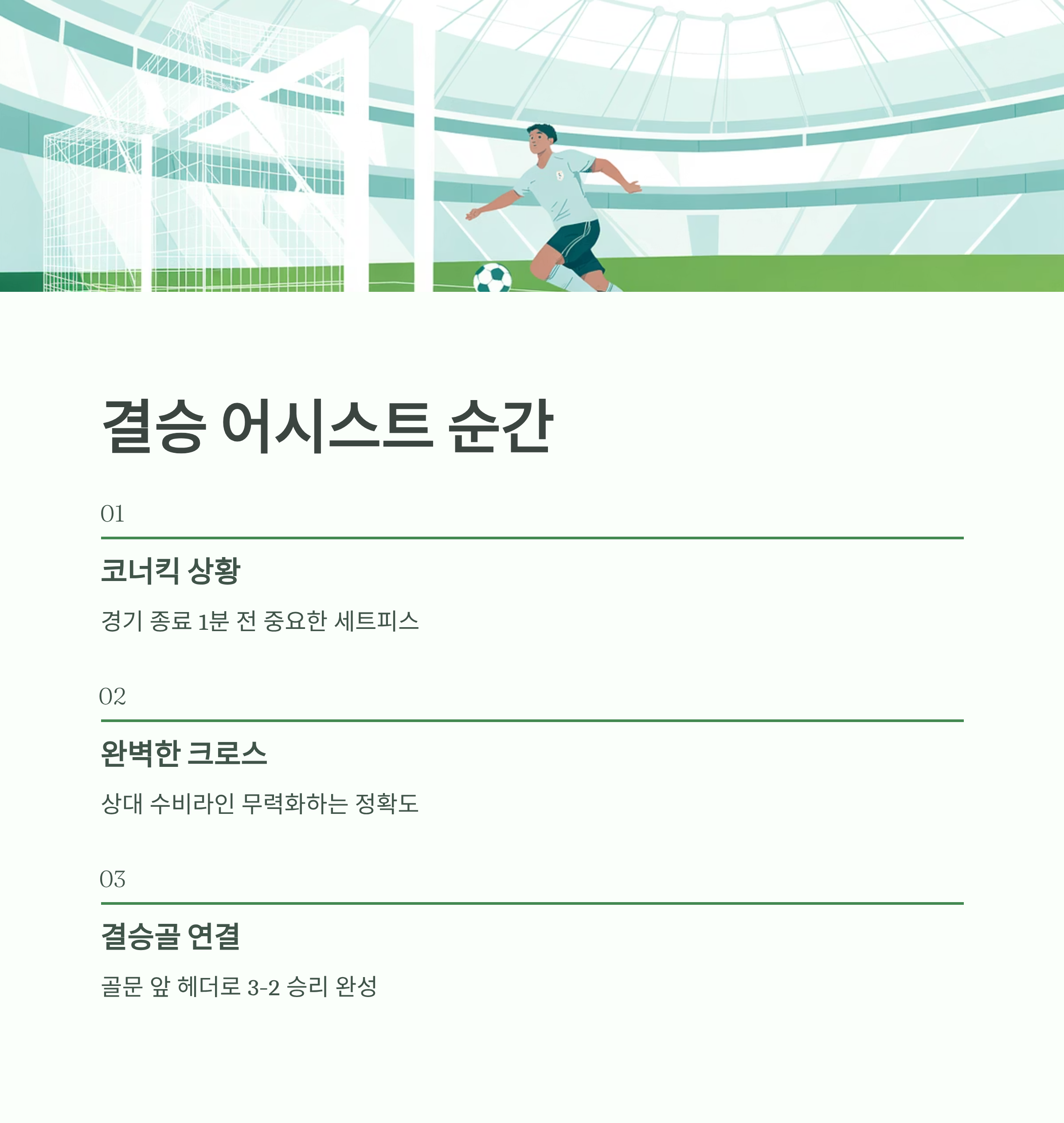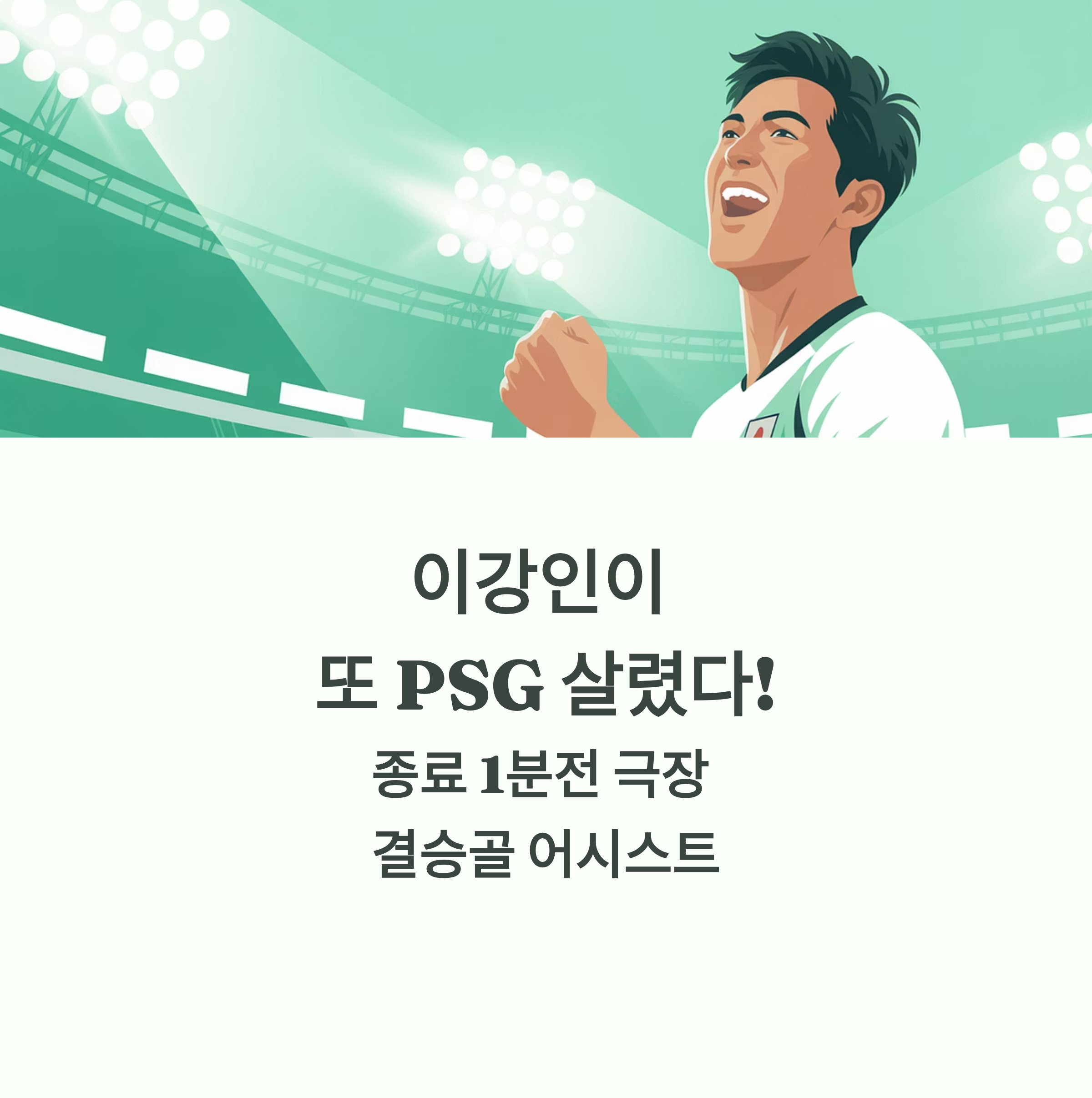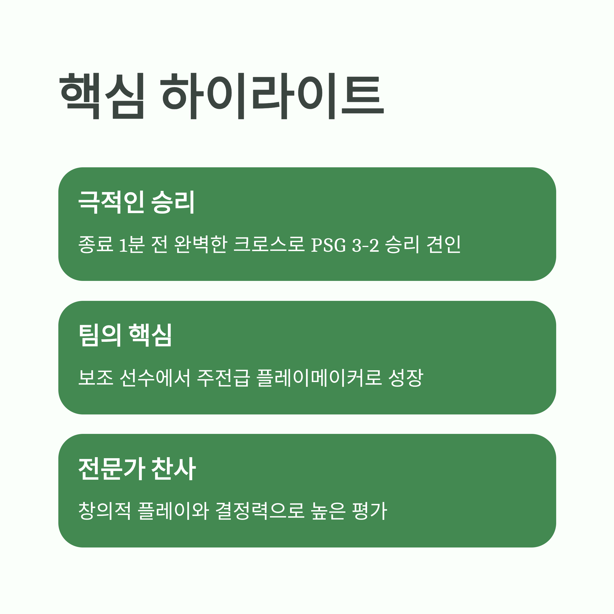 경기 종료 1분 전, PSG는 코너킥 상황에서 이강인을 선택했습니다. 이강인의 완벽한 크로스가 상대 수비라인을 무력화했고, 골문 앞에서 멋진 헤더로 연결되며 결승골이 탄생했습니다. 그의 킥精度과 공간 판단 능력은 이번 경기의 핵심 포인트였으며, 리그앙 전체에서도 경쟁력 있는 기술로 자리 잡고 있습니다. 또한, 이 장면은 이강인의 침착함과 팀을 이끄는 결정력을 입증하는 사례였습니다.