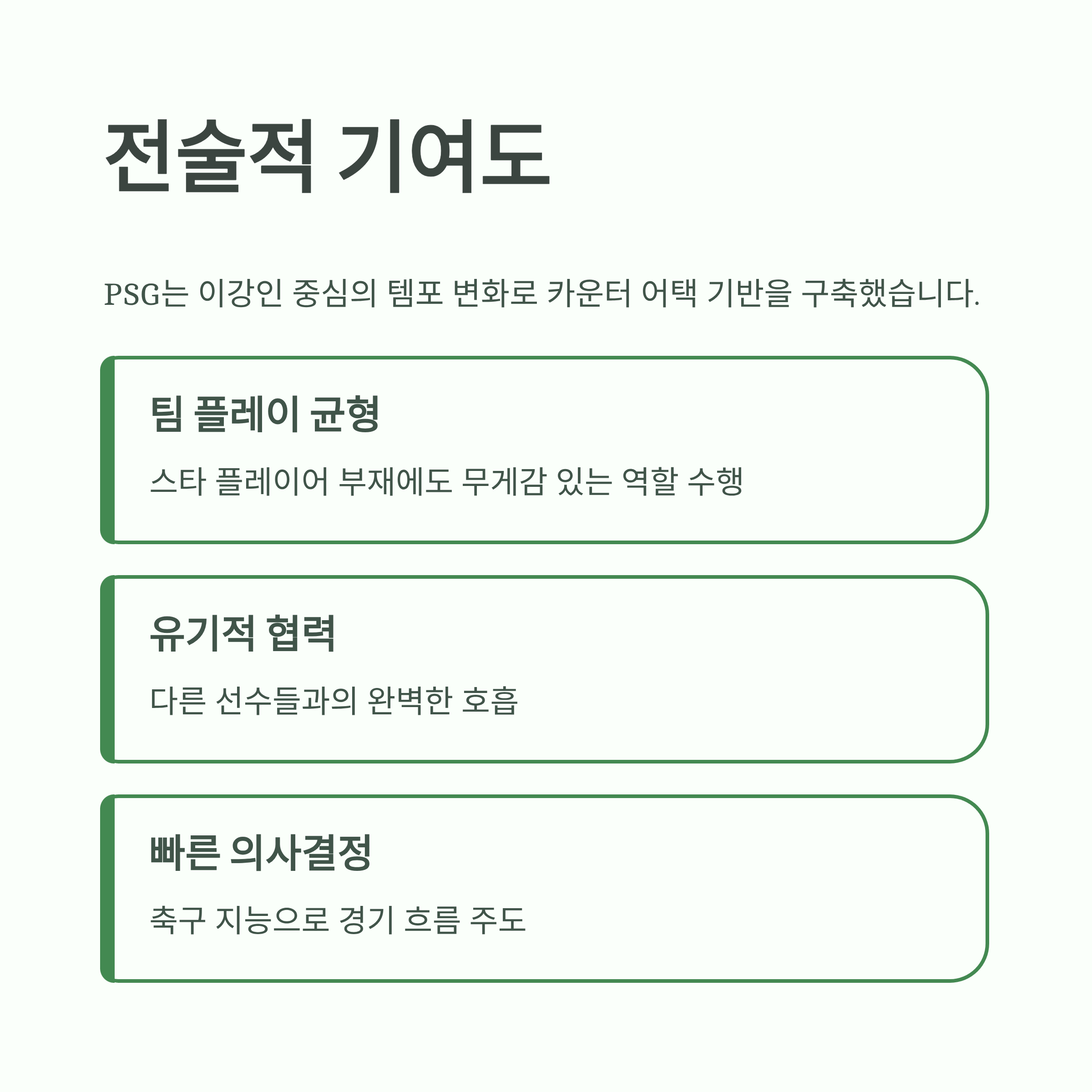 PSG는 전통적으로 화려한 공격 라인업을 자랑해왔지만, 경기 중반 이강인 중심의 템포 변화와 짧은 패스 플레이가 카운터 어택의 기반이 되었습니다. 이는 그의 축구 지능과 빠른 의사 결정 덕분에 가능했으며, 다른 선수들과의 유기적 협력도 돋보였습니다. 특히, 이날 경기에서 리오넬 메시와 네이마르 같은 스타 플레이어들이 부재했음에도 불구하고, 이강인이 팀 플레이의 균형을 맞추며 무게감 있는 역할을 수행했습니다.