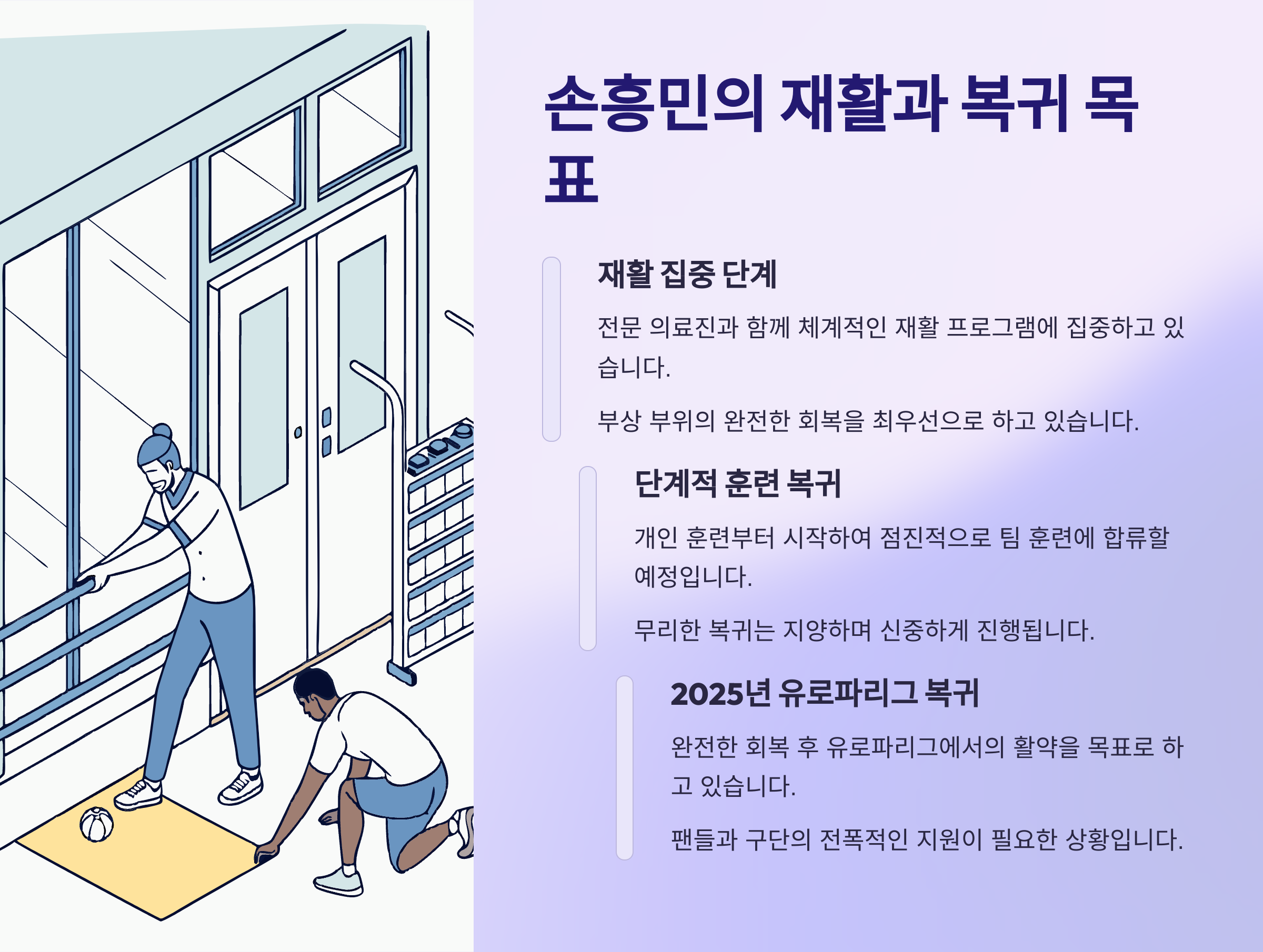 5. 손흥민은 2025년 유로파리그 복귀를 목표로 재활에 전념 중이며, 당분간 리그 결장이 예상됩니다.